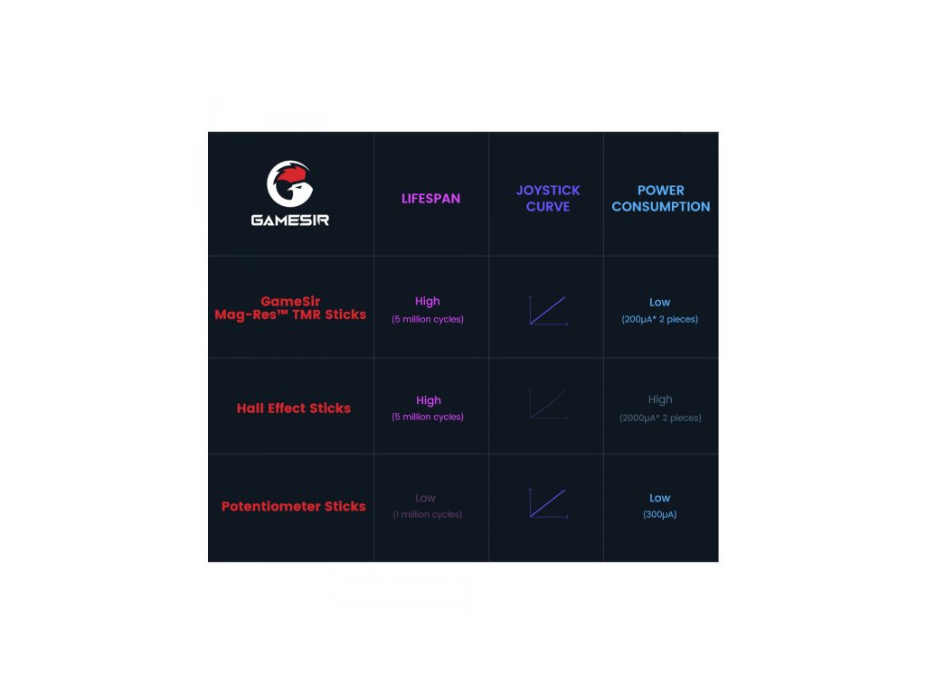 Přesné a odolné páčky GameSir Mag-ResTM TMR: Kombinují přesný výkon a nízkou spotřebu energie tradičních potenciometrických páček s vysokou odolností páček s Hallovým efektem, zajišťující vyšší a stabilnější odezvu.