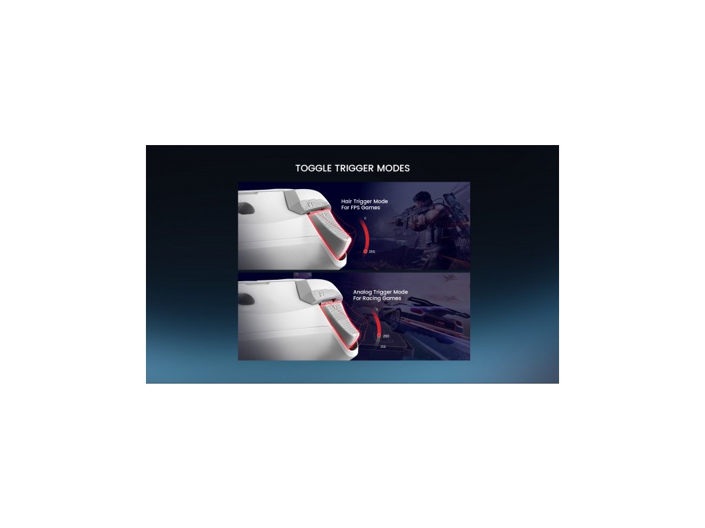 Magnetické Hall Effect triggery: S využitím přesně vyladěné technologie z ovladače G7 HE zajišťují analogové triggery Hall Effect konzistentní dráhu a hloubku jízdy. Ať už zrychlujete nebo brzdíte v závodních hrách, tyto spouště poskytují spolehlivé, plynulé a přesné ovládání. U FPS a akčních her vyžadujících citlivou zpětnou vazbu mohou hráči také přepnout režim spouštění na "Hair trigger" podržením tlačítek M + LT / RT po dobu 2 sekund.