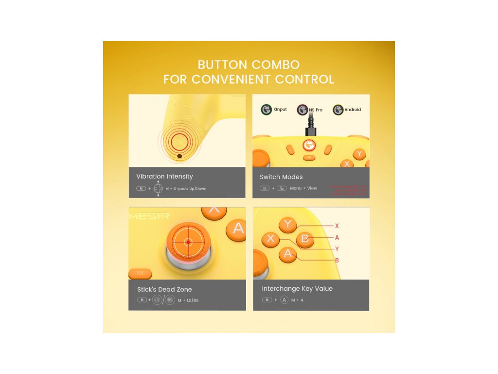 Multifunkční tlačítko M pro pohodlné ovládání: Pomocí multifunkčního tlačítka M můžete plynule upravovat různá nastavení, od intenzity vibrací, rozložení ABXY až po mrtvou zónu páček.