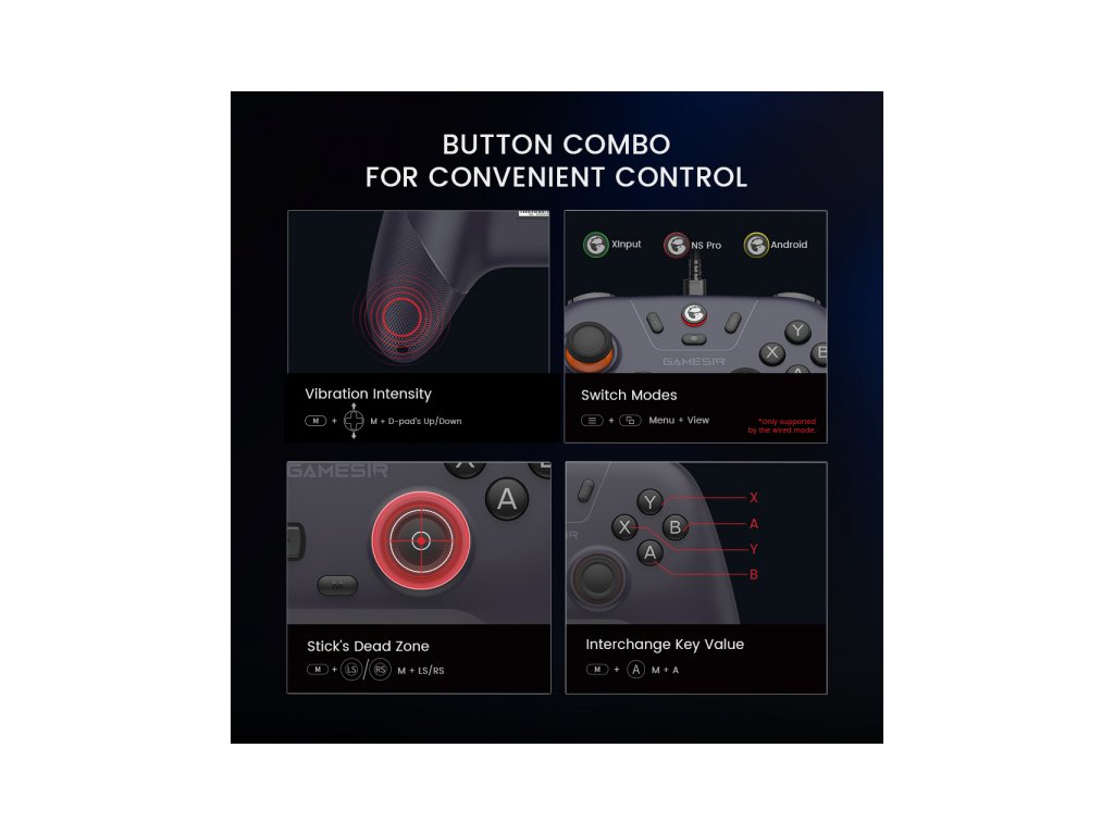 Multifunkční tlačítko M pro pohodlné ovládání: Pomocí multifunkčního tlačítka M můžete plynule upravovat různá nastavení, od intenzity vibrací, rozložení ABXY až po mrtvou zónu páček.