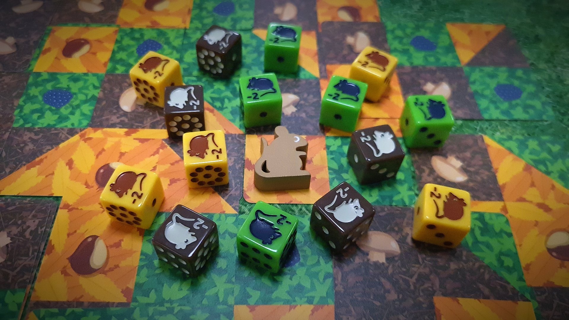 Jakmile překryjete kartu s určitým druhem podrostu stejným druhem, umístíte na tuto oblast unikátní kostku, která představuje plodiny a jejich hodnotu, ta se navyšuje s každým dalším překrytím této oblasti stejným druhem podrostu. Pokud budete nuceni oblast překrýt jiným druhem podrostu, položíte na ni kostku otočenou na stranu s myškou. Na konci hry vás útok myšky připraví o 2 body. Půlená oblast se dvěma podrosty je vlastně neutrální, ale nezvyšuje hodnotu na kostce. Vedle karet a kostek je ve hře k dispozici také roztomilý žeton myšáka Ryšáka – tedy po tom, co zjistíme, že Ryšák na konci hry stojí hned 5 záporných bodů, už tak roztomile nepůsobí. Ryšák ale díky své vlastnosti představuje možnost, jak vrátit do hry kostku, kterou zrovna nutně potřebujete, ale nemůžete ji použít, protože ji „blokuje“ myška – Ryšák myšku zastraší, nahradí ji a vy ji tak smíte umístit jako obvykle.