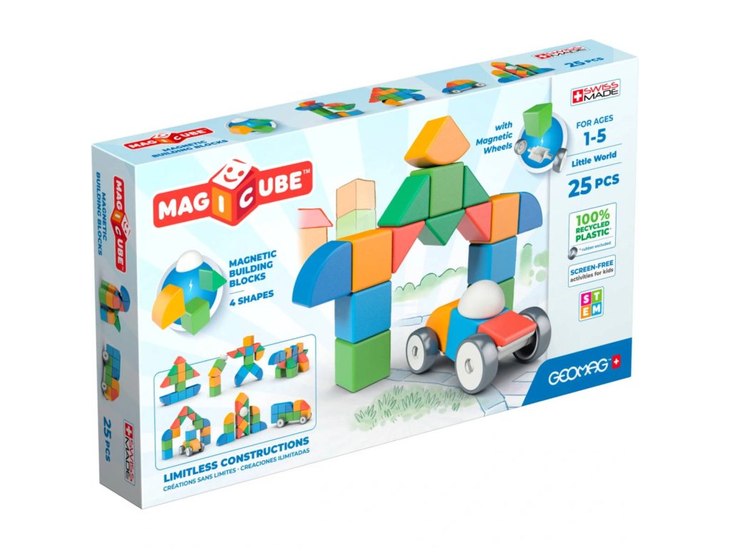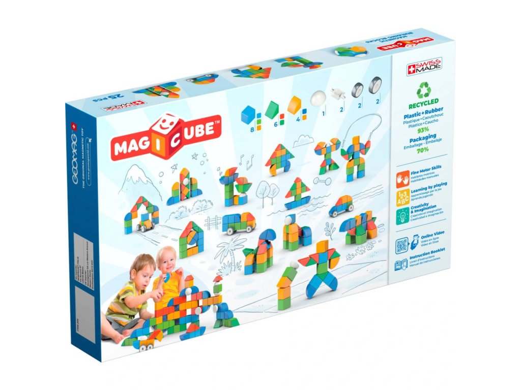Geomag Magicube Shapes 25 dílků je stavebnice určená pro děti od jednoho roku, která nabízí široké možnosti kreativního tvoření díky magnetickým dílkům v různých tvarech a barvách. Sada obsahuje celkem 25 dílků, přičemž kromě klasických magnetických krychliček jsou zde také čtyři kolečka a další tři speciální tvary, které umožňují stavbu nejen statických modelů, ale i pohyblivých vozidel. Díky magnetickému spoji lze jednotlivé dílky snadno spojovat a přestavovat, což podporuje rozvoj jemné motoriky i představivosti.