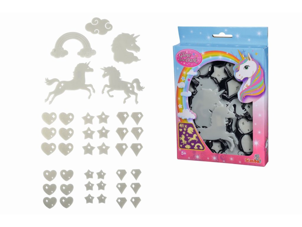 Sada fluorescenčních jednorožců a dalších motivů, které po nasvícení ve tmě svítí. Dekorace vhodná k nalepení na stěnu, strop či nábytek. Včetně lepicí gumy. Sada obsahuje 41 ks.