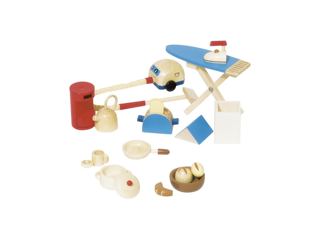 Tyto doplňky obsahují vše, co Vaše malé hospodyňky a jejich panenky potřebují. V sadě o 19 dílech najdete kávovar, konvičku, vysavač, žehlící prkno se žehličkou, toastovač, odpadkový koš, hrneček, košík na pečivo, pánvička, hrnec s pokličkou a potraviny. Hlavní vlastnosti: doplňky do domečku pro panenkyskládá se z 19 dílů