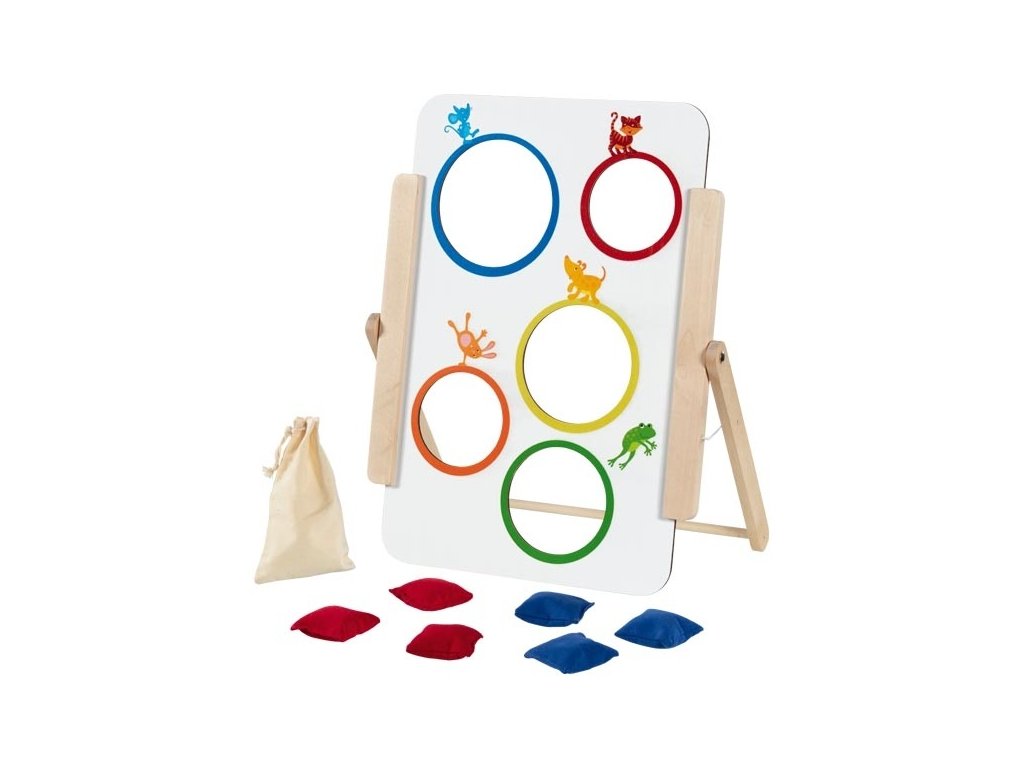 Házení na cíl je zábavná hra, která rozvíjí motorické dovednosti dětí a má dvě úrovně obtížnosti, takže je vhodná pro malé i větší děti. Terčem je dřevěná deska s 5 otvory, které jsou z jedné strany označeny zvířátky, a z druhé strany má každý otvor bodové ohodnocení. Cílem hry je trefit se látkovým pytlíkem do otvoru. Pokud se hry účastní starší děti, vyhrává ten, kdo svými hody dosáhne nejvyššího bodového skóre. Při hře s malými dětmi můžete vybrat, který otvor bude ten vítězný. Hlavní vlastnosti: terč k postavení a 6 házecích pytlíků (3 od každé barvy)zábavná hra pro malé i velkérozvíjí motorické dovednostivhodné od 4 let věku