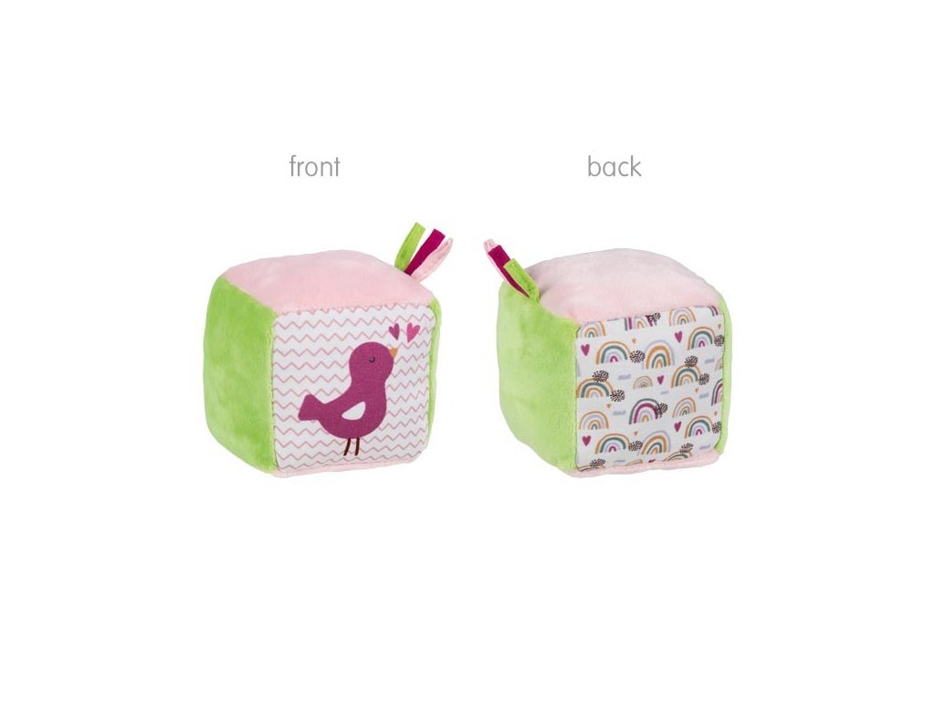 Měkká a hebká kostka je perfektní motorická hračka pro rozvoj smyslů a dovedností každého dítka. Kostka je vyvedena v jemných barvách s milou ilustrací. Je dozdobena několika stuhami, uvnitř má šustící fólii a rolničku, takže je atraktivní i po zvukové stránce. Hlavní vlastnosti: měkké a hebké provedenínízká hmotnostjemné barvy s milou ilustracítrénuje jemnou motorikuvhodná od narození