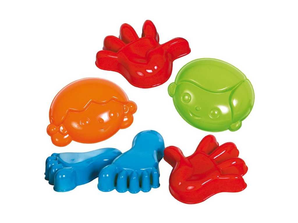Tyto pestrobarevné pískové formičky pomohou vašemu děťátku být kreativní při hraní na pláži nebo na pískovišti. Obsahuje dva veselé obličeje a navíc dvě ruce a dvě nohy k vytvoření stopy otisků rukou nebo nohou v písku. Jednoduše naplňte formičku pískem, poklepejte ji a zvedněte, abyste odhalili tvar, který po ní zůstal. Skládá se ze 6 hracích figurek. Vyrobeno z odolného plastu v jasných barvách. Hlavní vlastnosti: pomáhá rozvíjet zručnost a koordinacipodporuje kreativitu a představivostkoordinace rukou a očíideální na zahradu nebo plážvyrobeno z kvalitního, odolného plastu