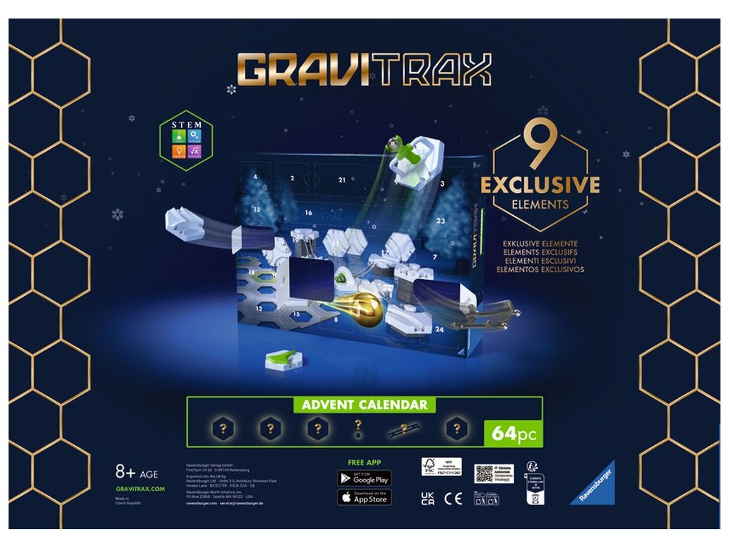 Připravte se na Vánoce s akční zábavou v „GraviTrax Adventním kalendáři“ a rozjeďte kuličky naplno! Za každými z 24 dvířek adventního kalendáře se skrývá překvapení – od stavebních dílků po akční prvky a vánoční kuličky. Začátečníci i fanoušci GraviTraxu se mohou těšit na 8 speciálních a exkluzivních nových dílků. Všech 24 prvků lze používat i bez startovní sady.