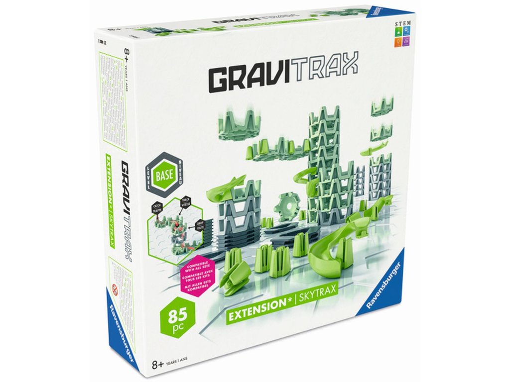 Rozšíření GraviTrax Skytrax otevírá nové možnosti ve vašem GraviTrax světě! Skytrax přináší úžasnou zábavu při stavění s novými vzrušujícími funkcemi. Obsahuje inovativní prvky, které umožňují nechat kuličky propadnout skrz, zachytit je a propojit jednotlivé části do podoby mostů! Díky klouzavým drahám budou kuličky svištět vysokou rychlostí kolem majestátních věží.