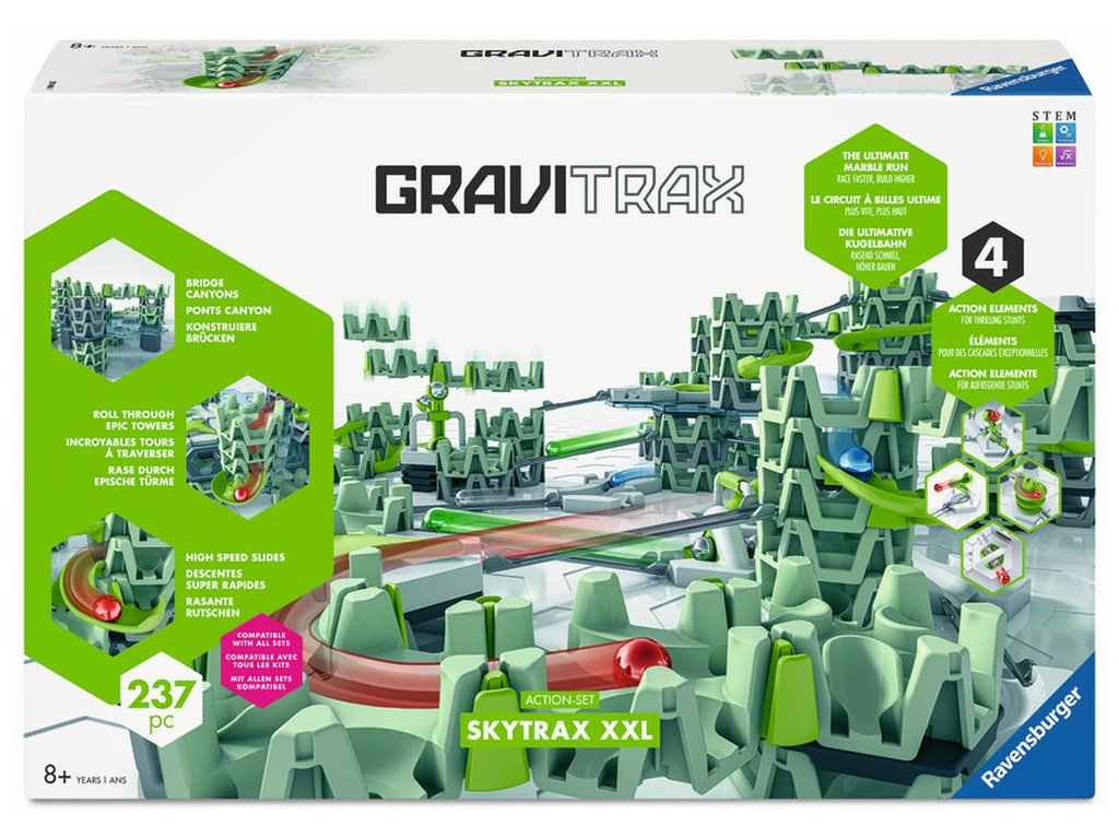 S touto sadou zažijete kreativní stavění jako nikdy předtím. Inovativní kameny Skytrax nabízejí zcela nové herní zážitky – nechte kuličky propadnout skrz, zachyťte je a propojte prvky do podoby mostů. Klouzavé dráhy roztočí kuličky kolem majestátních věží vysokou rychlostí. Tato velká sada je ideální pro všechny, kdo hledají dobrodružství plné triků a nekonečných možností při tvorbě kuličkových drah. Sada XXL obsahuje přes 215 různorodých prvků včetně plánu s ukázkovými dráhami. Mezi akčními prvky nebude chybět například lopatka, katapult, spirála, magnetické dělo nebo nové klouzavky.