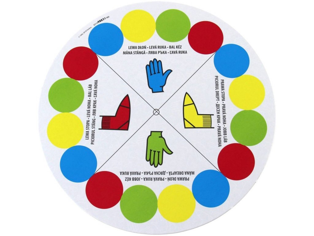 Zábavná společenská pohybová hra TWISTER. Roztočte kotouč a umístěte ruce nebo nohy na políčka barev na podložce! Neudržíte-li rovnováhu, pak prohráváte!