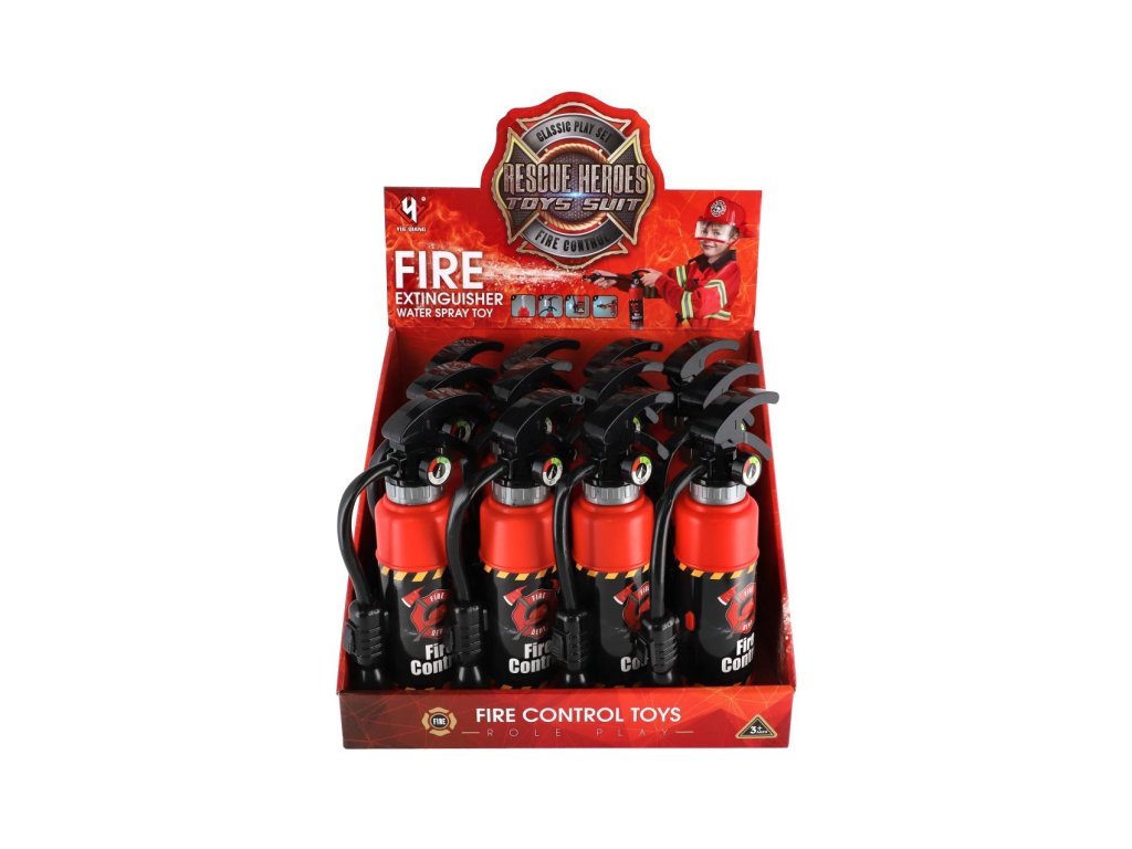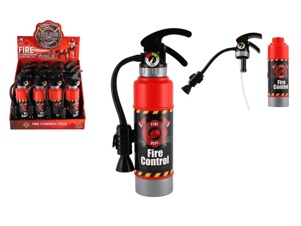 Děti mohou hasit imaginární požáry pomocí imitace hasicího přístroje. Hračka funguje tak, že se stiskne píst, načež voda vystříkne přes ohebnou šňůru.