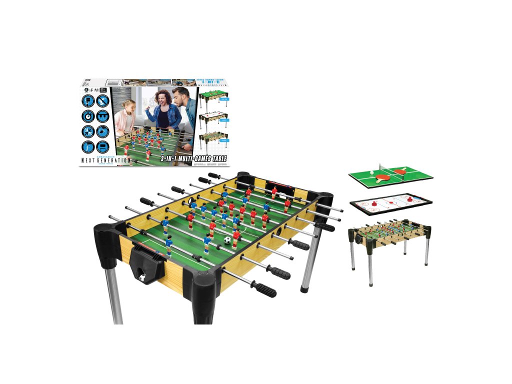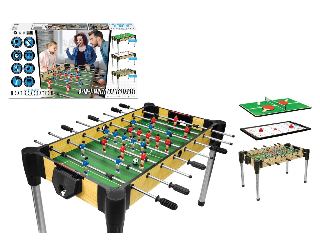 Univerzální herní stůl nabízí tři oblíbené společenské hry v jednom: stolní hokej, stolní fotbal a kulečník. Díky kompaktní velikosti 122 cm se hodí do domácností i herních místností. Snadná montáž, odnímatelné ocelové nohy a příslušenství pro všechny tři hry zaručují pohodlné hraní a skladování. Vlastnosti: • Stabilní konstrukce s odolnými odnímatelnými nohami• Rychlé sestavení pomocí přiložených dílů a rohových spojek• Možnost přeměny na stolní hru bez nohou pro kompaktní úložení• Kompletní vybavení pro hru stolního fotbalu, hokeje a kulečníku Herní pravidla: • Stolní fotbal: pro 2 až 4 hráče, cílem je vstřelit soupeři 9 gólů.• Stolní hokej: pro 2 hráče, skórujte první 9 branek pomocí červených střel.• Ping pong (stolní tenis): pro 2 hráče, set vyhrává ten, kdo jako první dosáhne 11 bodů s dvoubodovým náskokem. Obsah balení: • Hrací deska s možností přepnutí mezi hrami• Ocelové nohy s montážními prvky• Rukojeti pro ovládání figur• Síťky, pálky, puky a míčky dle potřeby her Bezpečnostní upozornění:Nevhodné pro děti do 3 let kvůli malým částem. Doporučeno pro děti od 8 let. Praktický a zábavný herní set pro celou rodinu, který přinese nekonečné hodiny zábavy a soutěžení.