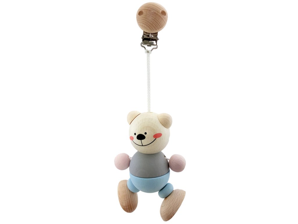 Barevný medvídek ze dřeva, který lze připevnit na kočárek, postel, nebo oblečení. Hlavní vlastnosti: velikost: cca 9 cmvyrobeno z původního, neošetřeného dřeva100% vyrobeno v Německu