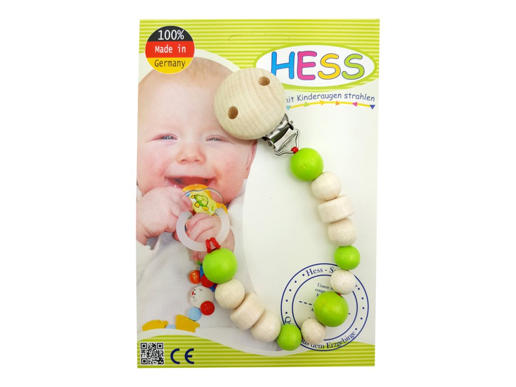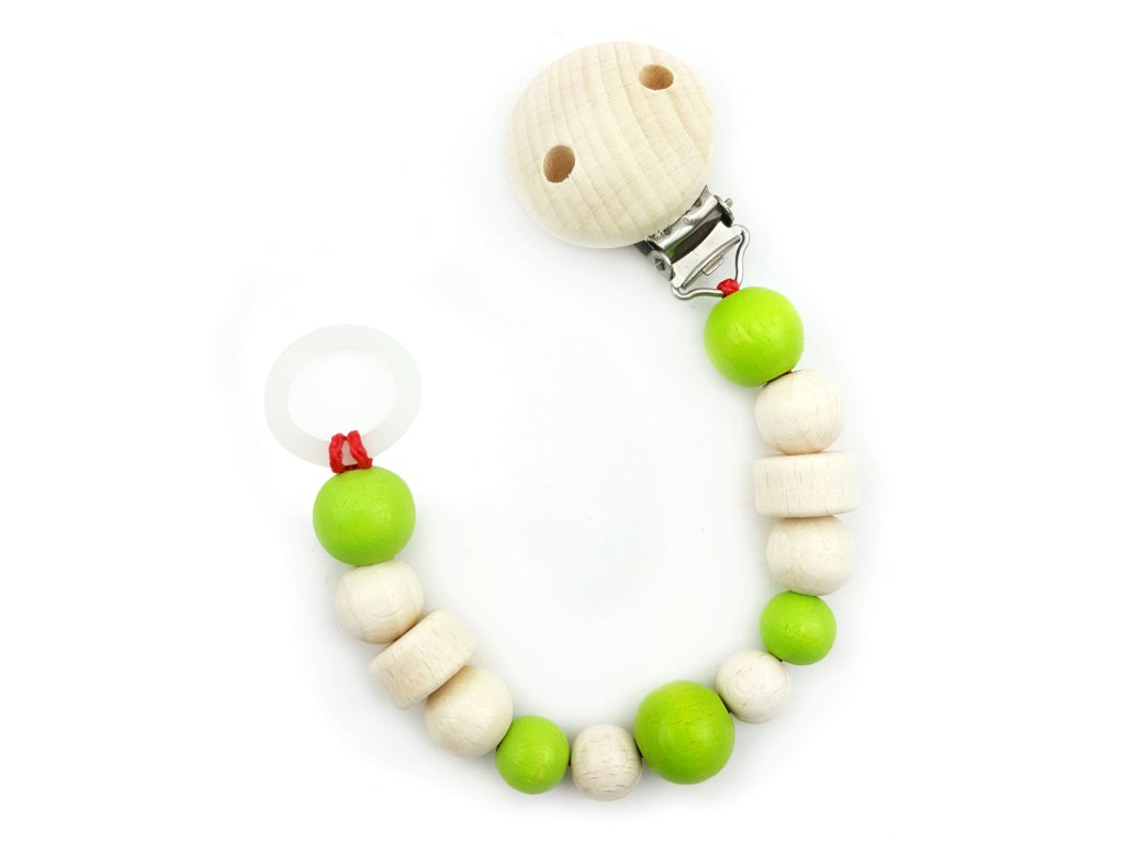 Řetízek opatřený kovovým klipsem a univerzálním pružným silikonovým kroužkem k uchycení dudlíku. Kvalitní povrchová úprava a nezávadné barvy jsou odolné vůči slinám i potu. Je vyroben v Německu, ze dřeva z německých lesů. Hlavní vlastnosti:univerzální silikonový kroužekpraktický kovový klipsodolné a ekologické zpracování