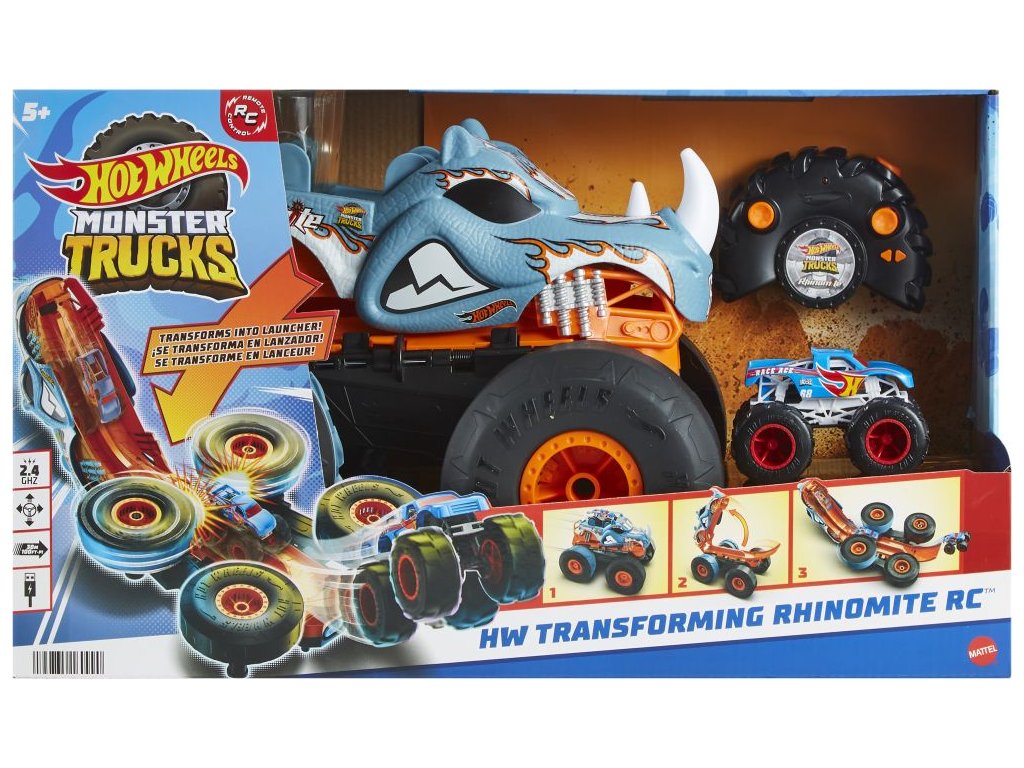Bourejte, rozbíjejte a uhánějte šílenou rychlostí s autem Hot Wheels® RC Monster Truck Transformující se Rhinomite! Tento Monster Truck na dálkové ovládání v měřítku 1:12 je vybaven masivními pneumatikami, autentickými dekory a režimem Dynamite - velký Monster Truck se transformuje na motorový zrychlovač pro menší Monster Trucky v měřítku 1:64. Dokáže je vystřelit až do výšky 91 cm! Součástí balení je jeden model Race Ace™ v měřítku 1:64 - během RC hry ho uložte do lože většího kamionu a po velké proměně ho vypusťte pomocí zrychlovače. Předvádějte parádní triky a užijte si jízdu o rychlosti až 9 km za hodinu. Barvy a provedení se mohou lišit.