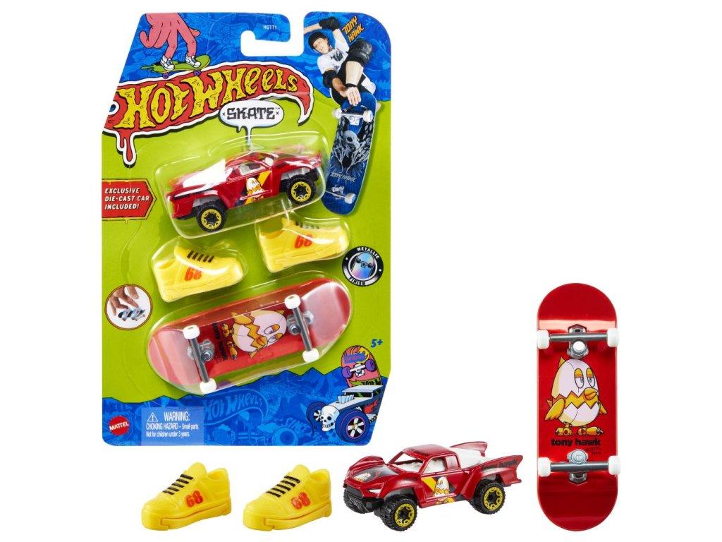 Vychutnejte si kompletní zážitek s tímto skvělým setem Hot Wheels® Sběratelská kolekce Fingerboard a boty, který obsahuje fingerboard, skate boty a jeden angličák Hot Wheels®. Kolekce byla navržena ve spolupráci s legendou skateboardingu Tony Hawkem a pyšní se prvotřídními detaily s metalickou grafikou fingerboardu a exkluzivním angličákem Hot Wheels®. Odnímatelné skate boty jsou navrženy tak, aby udržely konečky prstů na místě, když experimentujete s ollies nebo se skoky a obraty o 360° na angličáku Hot Wheels®. Děti budou během chvilky jezdit jako profíci, když zvládnou stylové kousky stejně jako Tony Hawk! Děti i sběratelé budou chtít sesbírat všechny sety fingerboardů s jejich prvotřídním designovým provedením. Obsahuje 1 fingerboard, 1 pár skate bot a 1 angličák Hot Wheels®. Každý set se prodává samostatně v závislosti na dostupnosti. Barvy a vzhled výrobku se mohou lišit.
