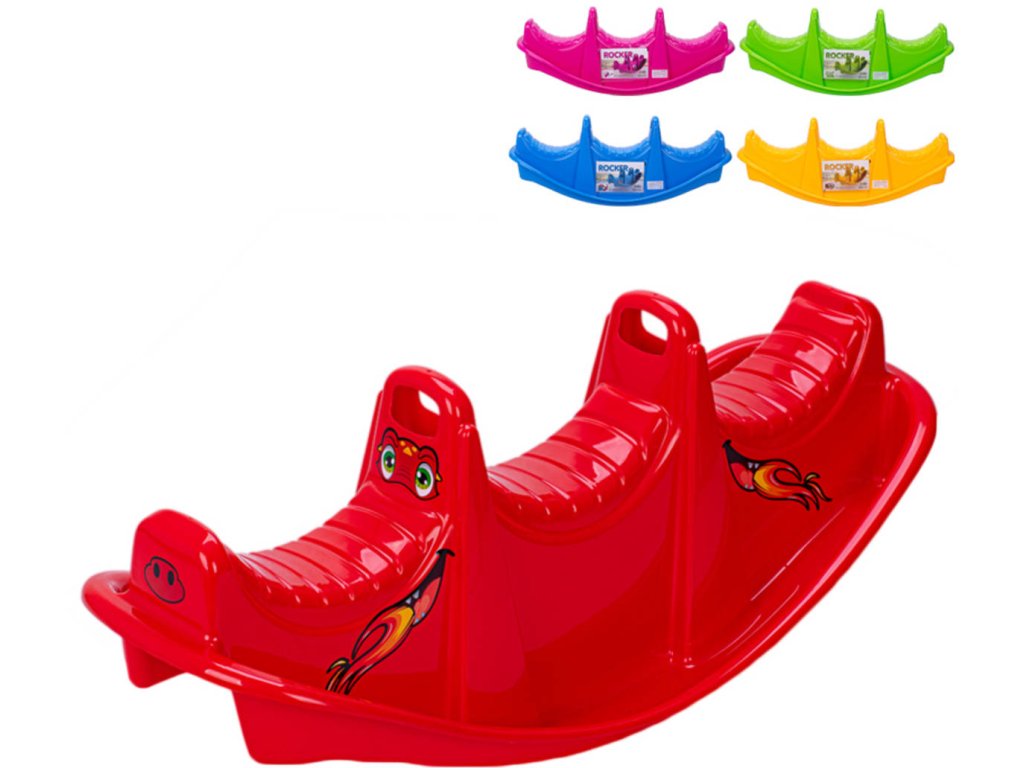 Jednoduchá dětská plastová houpačka zvířátko, oboustranné houpadlo - kolíbka na zem, se 2 úchyty pro 2 děti, 5 barevných variant, součástí samolepky. Velikost: 101 x 37 x 39cm.