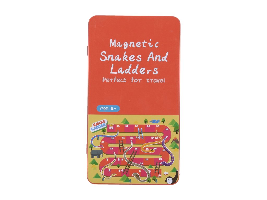 Hra hadi a žebříky magnetická cestovní. Rozměry pouzdra 10x18,5 cm. Plechové pouzdro slouží po otevření jako hrací deska. Figurky jsou magnetické. Součástí hrací kostka.