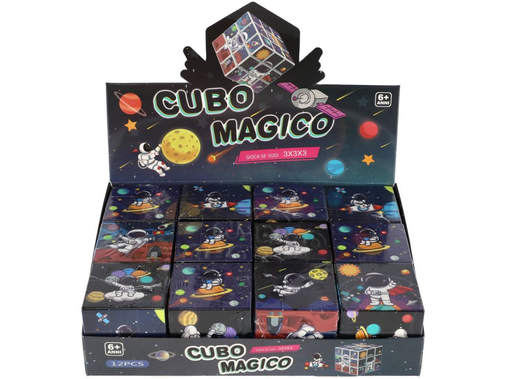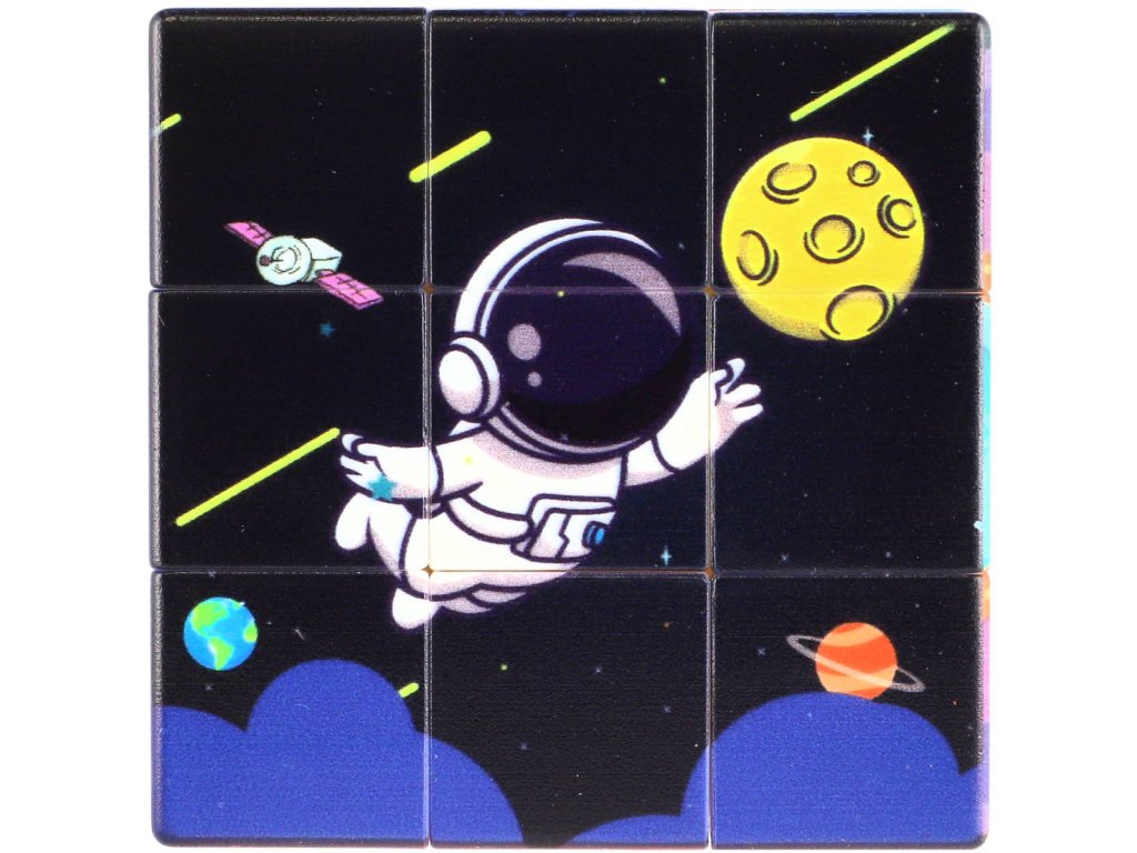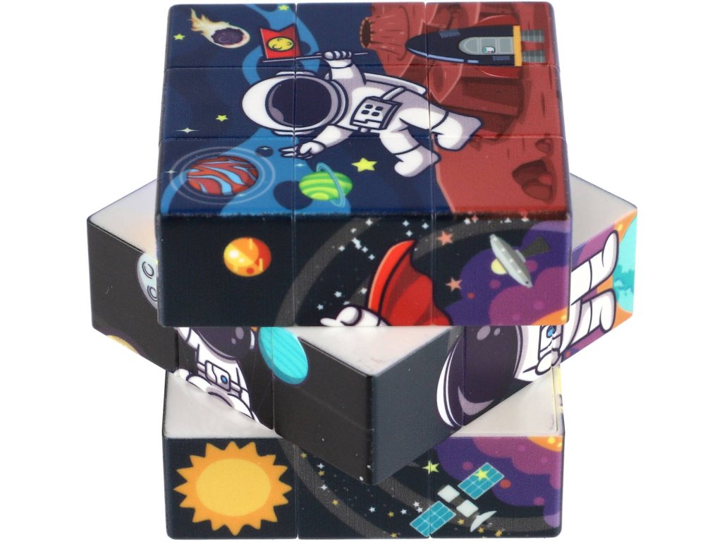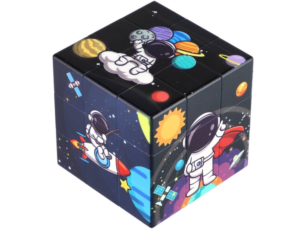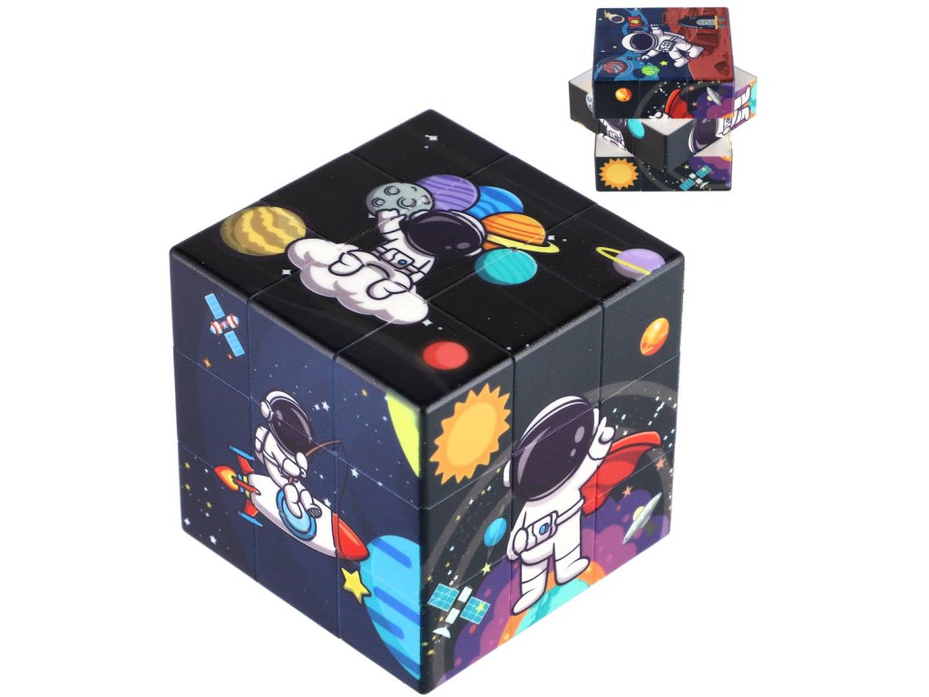 Hra Kostka 3x3x3 (Rubikova), plastový skládací hlavolam s motivem Vesmír. Skládačka s obrázky - na každé straně kostky odlišný motiv. Velikost 6cm.