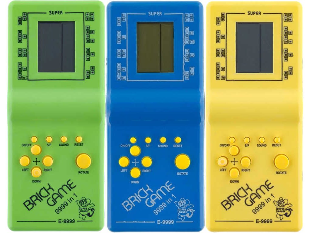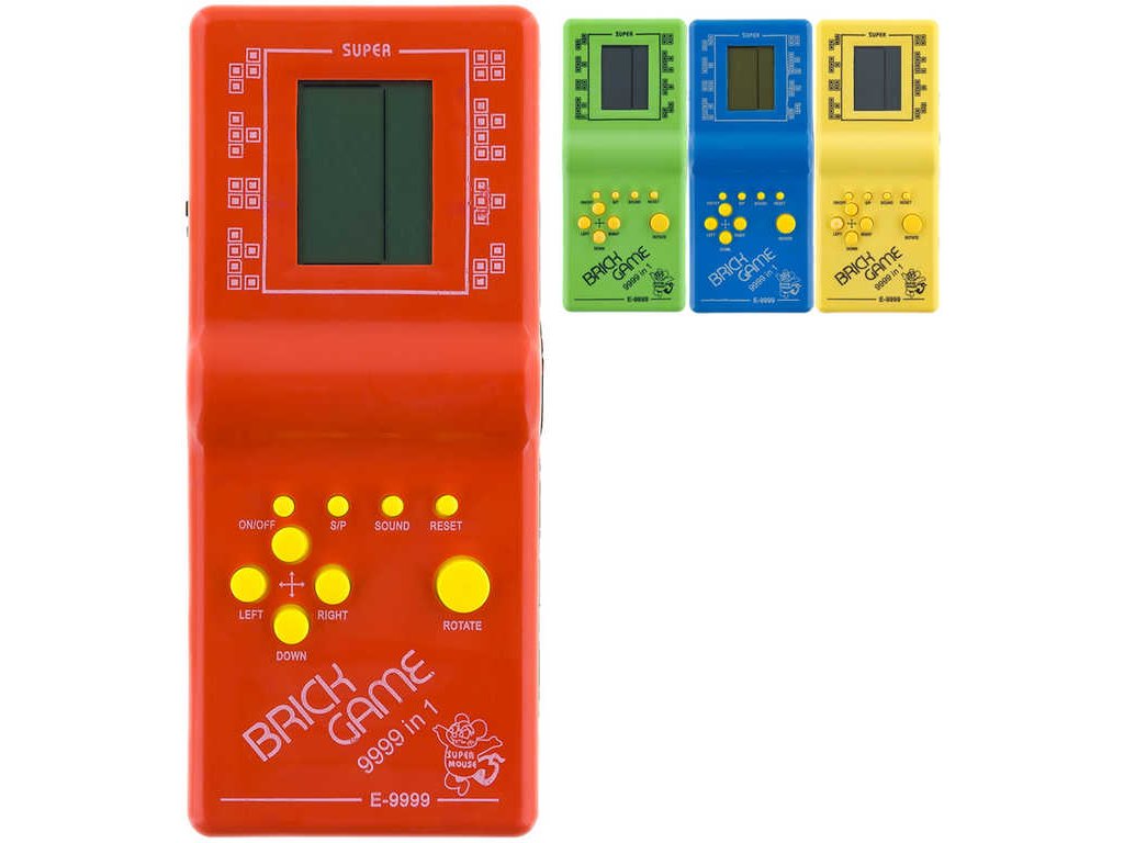 Dětská elektronická plastová hra Kvadrix, na způsob hry Tetris, čtyři barevné varianty. Baleno v krabičce. Součástí konzole je velké množství dalších her.