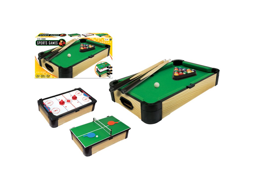 Kompaktní herní stůl nabízející tři klasické hry v jednom – kulečník, stolní hokej a ping pong. S rozměrem 60 cm je ideální pro domácí zábavu a rychlé přepínání mezi hrami. Snadná montáž díky přiloženým dřevěným panelům a rohovým spojkám, doporučena spolupráce dvou osob. Obsah balení zahrnuje kulečníkové koule, dřevěná tága, trojúhelníkový stojan, červené střely a puk na hokej, pálky, síť a míček pro ping pong, plus herní desky. Hra kulečníku s „osmičkou“ nabízí standardní pravidla – hráči se snaží legálně zasázet své koule (plné nebo pruhované) a nakonec černou osmičku. Možnosti po rozstřelu zahrnují různé scénáře, například kdo si zvolí skupinu koulí, nebo automatické vítězství za zasazení osmičky při rozehrání. Stolní hokej je hra pro dva hráče, kteří se snaží vstřelit soupeři 9 gólů pomocí červených střel a puku, přičemž je zakázáno dotýkat se puku jinak než střelou. Ping pong je určeno pro dva hráče, hraný dle pravidel stolního tenisu s vítězstvím hráče, který první získá 11 bodů (s dvoubodovým náskokem). Upozornění: Nevhodné pro děti do 3 let, doporučeno od 4 let. Obsahuje malé části.