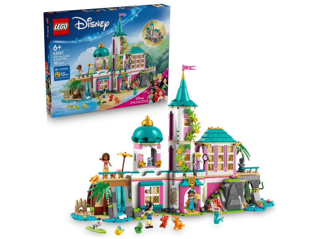Děti a fanoušci studia Disney objeví kouzelný svět se stavebnicí LEGO® | Disney (43267) Hrad princezen a královští domácí mazlíčci. Tento hrad pro kluky a holky od 6 let obsahuje pokoj pro každou princeznu a poslouží jako krásný dárek. Hrad můžetevystavit zavřený a najdete v něm spoustu doplňků a funkcí, včetně luku, tunelu s vodopádem, odnímatelného nábytku a spoustu dalších. Stavebnice obsahuje 5 minipanenek LEGO | Disney: Ariel, Lociku, Mulan, Jasmínu a Vaianu. Nechybí také 5 zvířecích posta v LEGO | Disney: Šupinka, Pascal, Rádža, Pua a vůbec poprvé také Mushu. Tato stavebnice Disney Princess představuje zábavný dárek pro holky a kluky, které s ní čeká nekonečné hraní. Model můžete zkombinovat s dalšími stavebnicemi LEGO | Disney z této řady (všechny se prodávají samostatně). Díky aplikaci LEGO Builder můžou děti navíc stavět společně s kamarády a rodinou a užít si společný stavitelský zážitek. Stavebnice obsahuje 787 dílků.