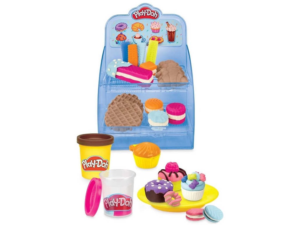 Hra na cukráře: malí budoucí baristé mohou z hmoty Play-Doh vyrábět sušenky, koblihy, koláčky a další. Vyskládejte je na stojan, který má také odnímatelné formy na výrobu ještě více falešného pečiva.