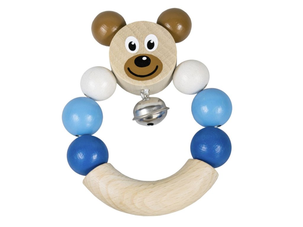 Dřevěné chrastítko s medvídkem v modré barvě. Snadno uchopitelné, rolnička jemně cinká.