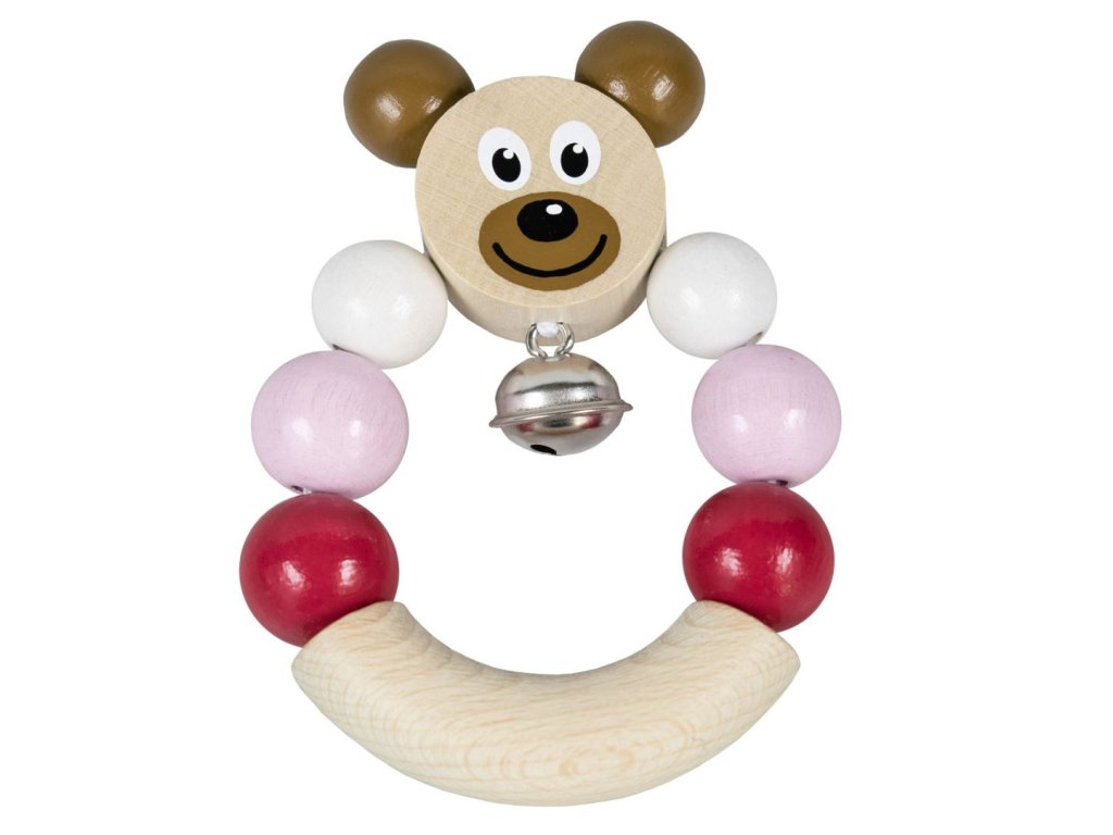 Dřevěné chrastítko s medvídkem v růžové barvě. Snadno uchopitelné, rolnička jemně cinká.