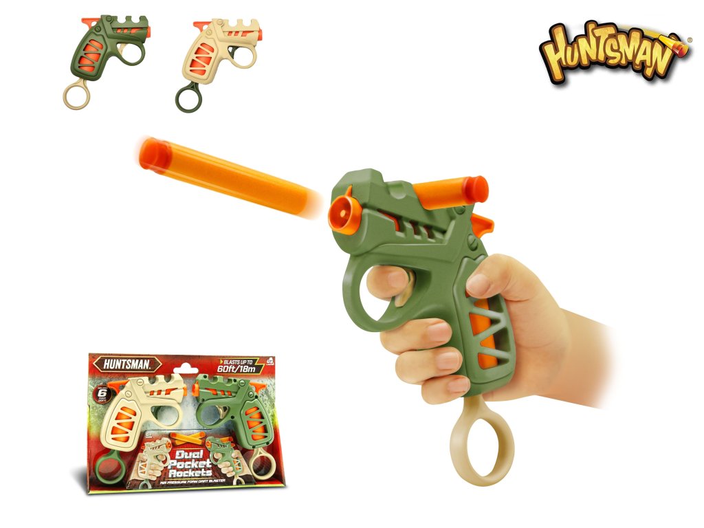 Huntsman Pistole kapesní natahovací 2ks set Velikost 13 cm. Dostřel až 18m. Střela se vkládá do hlavně zbraně, nabití pistole se provádí natažením prstýnku ve spodní části, spouští se vystřelí. Obsah balení - 2 pistole, 6 pěnových střel.