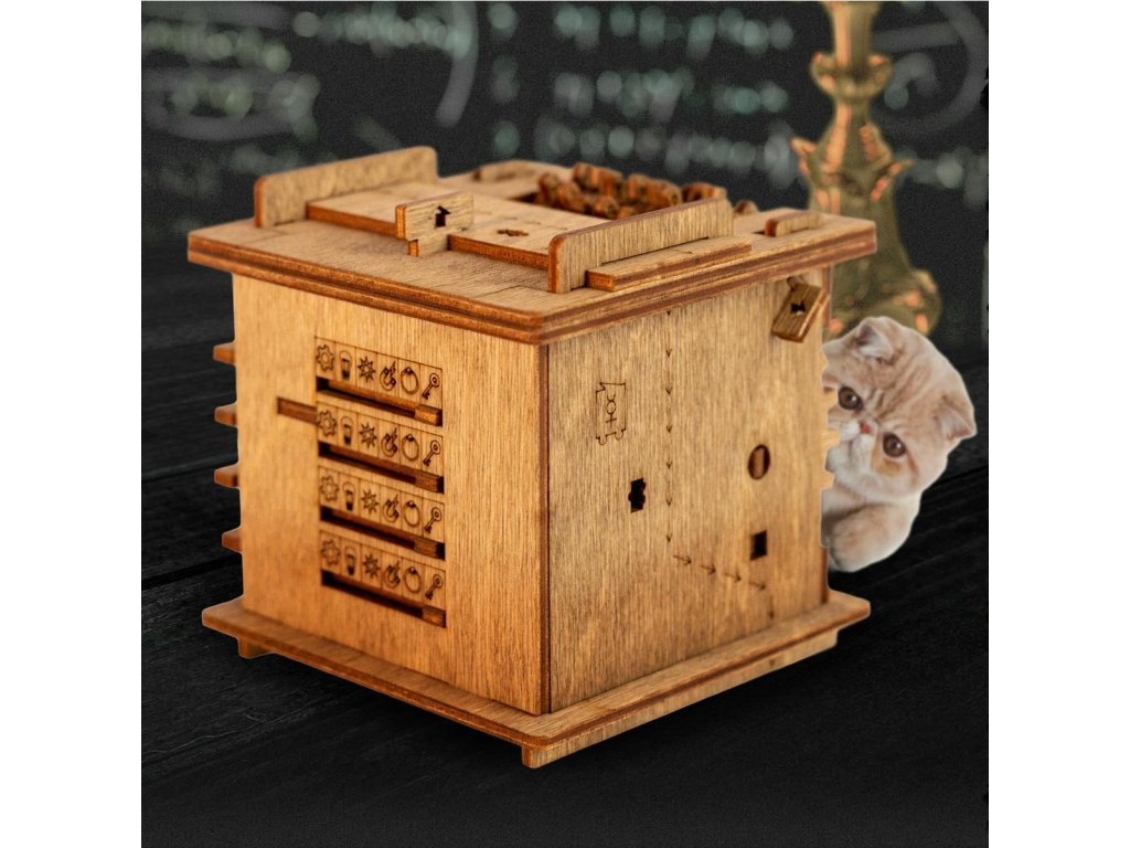 Už žádný nudný balící papír! Věnujte dárek s překvapením a zažijte strhující zábavu Chcete darovat peníze, šperk nebo jiný drobný dárek? A chcete předat dárek skutečně originálním způsobem? Spojte překvapení se zkouškou důmyslu a trpělivosti. S hlavolamem v inovativním designu vyrobeným z březového dřeva neuděláte chybu. Nenechte si ujít vzrušující zážitek ze hry. A nemusíte si hrát sami, zapojte celou rodinu nebo přátele. Hlavolam je pečlivě vyroben z přírodního materiálu a všechny jeho části byly přesně vyřezány nejlepší laserovou technologií. Příběh:Schrödingerova kočka je myšlenkový experiment rakouského fyzika Erwina Schrödingera, který ilustruje problémy kvantové mechaniky v každodenních předmětech. V tomto experimentu jsou kočka a nějaký jed uzamčeny v uzavřené krabici. Kvantová mechanika říká, že po chvíli bude kočka mrtvá i živá. Bohužel Schrödinger kvůli své zaneprázdněnosti na kočku úplně zapomněl.Jsme si jisti, že kočka stále žije a musíte ji zachránit! Hlavní vlastnosti: 52 dílkůdoba hry 45-60 minutvyrobeno z vysoce kvalitního březového dřevapro 1-2 hráčetajný prostor uvnitřkreativní dárkové balení pro malý dárekopakované použitívhodné od 14 let Jak hrát:Krok 1Řešte úkoly jeden po druhém, dokud neodhalíte tajný prostor. Krok 2Pokud si nebudete vědět rady, podívejte se na tuto webovou stránku. Krok 3Na konci dobrodružství na vás bude čekat překvapení a možnost zvěčnit své jméno na zdi slávy. Krok 4Po otevření hlavolam můžete znovu zavřít a předat dál, ať si zábavu užijí i ostatní. VAROVÁNÍ! Níže uvedená videa obsahují spoilery řešení! Prosím, sledujte pouze první 2 minuty, pokud si chcete užít hádanku a vyřešit hlavolam sami.