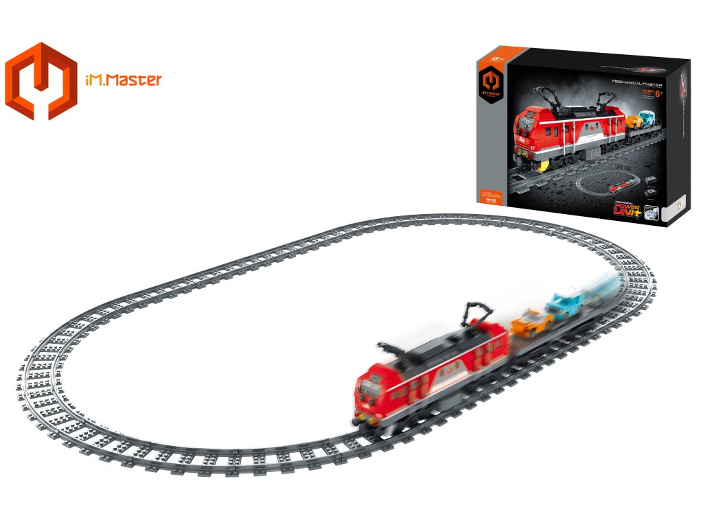 iM.Master Stavebnice vlak červený s auty. Rozměry vlaku 53,6x12x6 cm, železnice 123x71,8 cm. 617 dílků. Vestavěný bateriový pack 400mAh 3.7V lithium do vlaku součástí. Nastavení rychlosti jízdy vlaku, změna směru jízdy dopředu a dozadu. Přepínač ON/OFF. Kolečko pro nastavení směru jízdy na střeše vlaku. USB nabíjecí kabel součástí.
