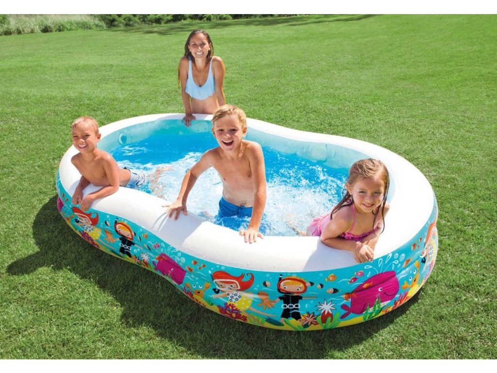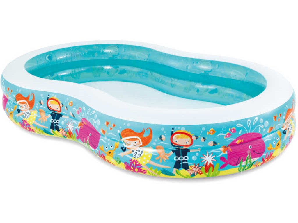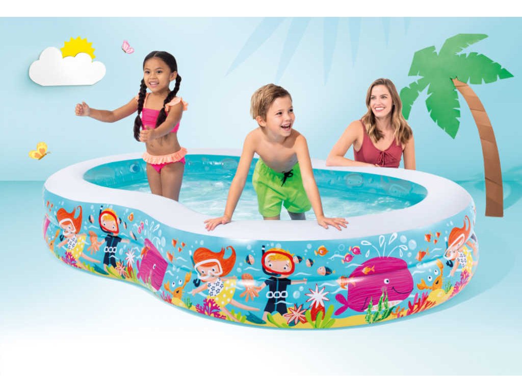 Oválný rodinný bazén pro děti s exotickým mořským potiskem "Lagoon paradise". Dvě vzduchové komory s dvojitým ventilem. Baleno v krabici.