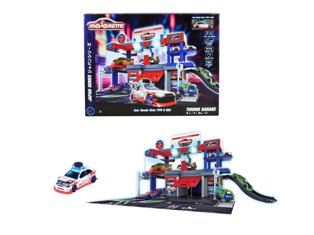 Tuningová garáž Majorette má 2 patra, čerpací stanici, manuálně ovládaný výtah a světelné i zvukové efekty, zvedací plošinu, tuningovou část a odpalovač autíček. Jedno autíčko 7,5 cm součástí - Honda Civic TYPE R EK9. Rozměry po sestavení: 35,5 x 45,5 x 23,5 cm.