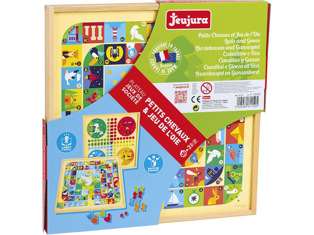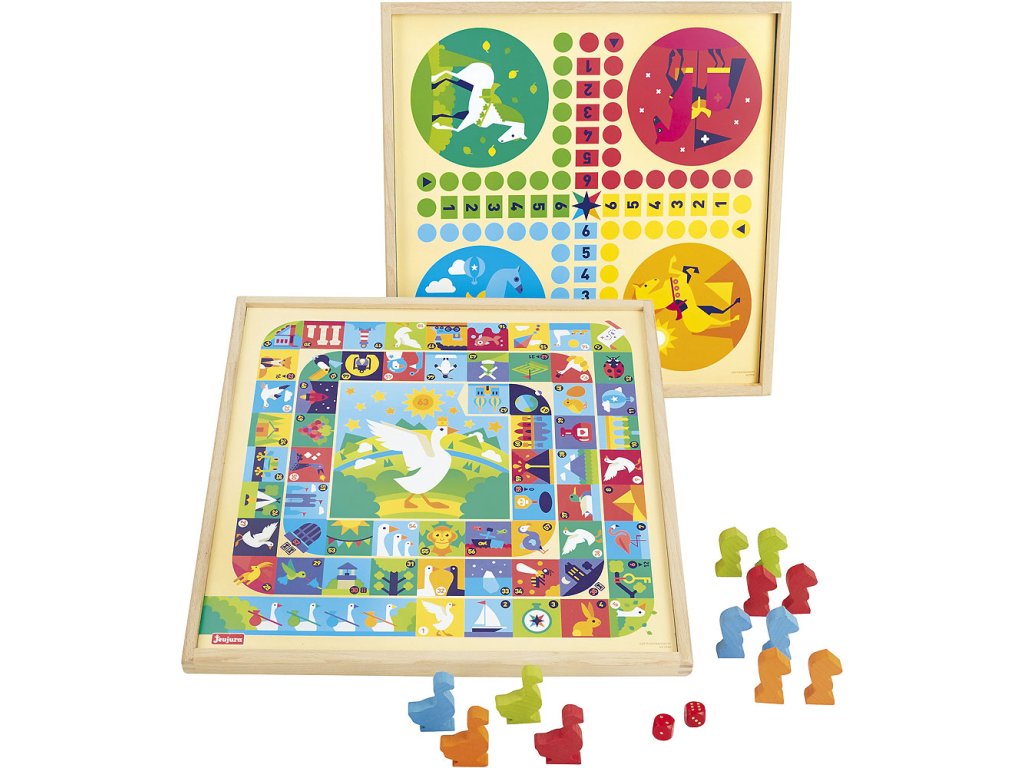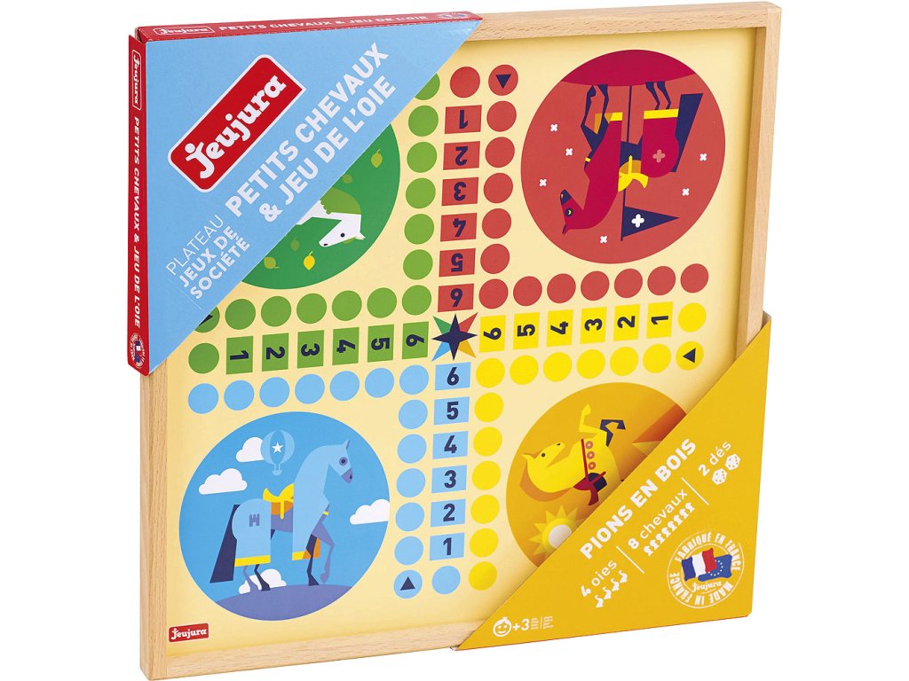 Deska s dvojicí her. Obsahuje husu a variantu člověče nezlob se s figurkami koní. Souprava je vyráběna ve Francii, z masivního bukového a borovicového dřeva francouzského původu. Součásti jsou ošetřeny výhradně za použití barev a laků na bázi vody. Hlavní vlastnosti:pro 2–4 hráče8 figurek koní, 4 figurky hus a 2 kostkyvšechny součásti z masivního dřevavyrobeno ve Francii Pravidla her: Člověče nezlob se: Cílem hry je obejít s koňmi hrací pole a dostat je do domečku. Všechny figurky jsou před začátkem hry umístěny ve startovním domečku, který je vyznačen stejnou barvou jako figurky. Hraje se ve směru hodinových ručiček. Hráči házejí kostkou při každém tahu. Figurky posouvejte o tolik bodů, kolik padlo při hodu kostkou. Pokud figurka skončí na políčku obsazeném cizí figurkou, je tato odstraněna ze hry a vrácena zpět do domečku. Na políčko obsazené jinou vlastní figurkou vstoupit nelze. Aby hráč mohl nasadit do hry novou figurku, musí hodit šestku. Pokud nemá hráč ve hře žádnou figurku, hází, dokud mu nepadne šestka, maximálně však 3×. Pokud hodí šestku umístí koně na startovní políčko stáje a hraje znovu. Aby hráč ukončil kolo, musí jeho kůň přejít na všechna políčka stáje označená 1 až 6. Husí hra: Cílem hry je vstoupit na vítězné políčko č. 63. Před začátkem hry si každý hráč zvolí svou figurku husy. Poté každý z nich hodí oběma kostkami zároveň. Hráč, který hodil nejvyšší číslo, začíná. Figurky posouvejte o tolik bodů, kolik padlo při hodu kostkou. Jestliže skončíte na políčku s obrázkem husy, máte štěstí – posuňte svou figurku znovu o stejný počet polí. Když hodíte šestku a trojku při prvním tahu, posouváte se na pole č. 26.Pokud hodíte čtyřku a pětku, posouváte se na pole č. 53.Pokud šlápnete na pole č. 6, posouváte se na pole č. 12.„Ten, kdo jde lovit, ztrácí své místo…“ Na políčku č. 22 se musíte posunout o 3 pole zpět.Abyste se dostali ze studny na poli č. 30, musíte hodit šestku.Na poli č. 35 se dostanete do hotelu, jedno kolo stojíte.Bludiště na poli č. 42 vás pošle zpátky na pole č. 31.Ve vězení, na poli č. 52 stojíte dvě kola.Na poli č. 58 se ztratíte v žaláři a musíte se vrátit zpět na start.Pokud hodíte takové číslo, které by Vás dostalo za pole č. 63, musíte se o tolik polí posunout zpět po herní ploše.