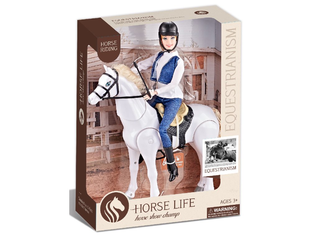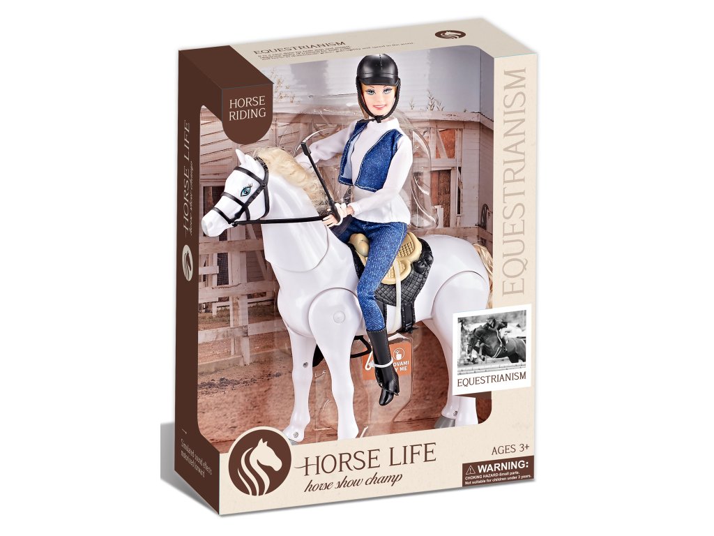 Jezdecký bílý kůň na baterie se zvuky + jezdkyně