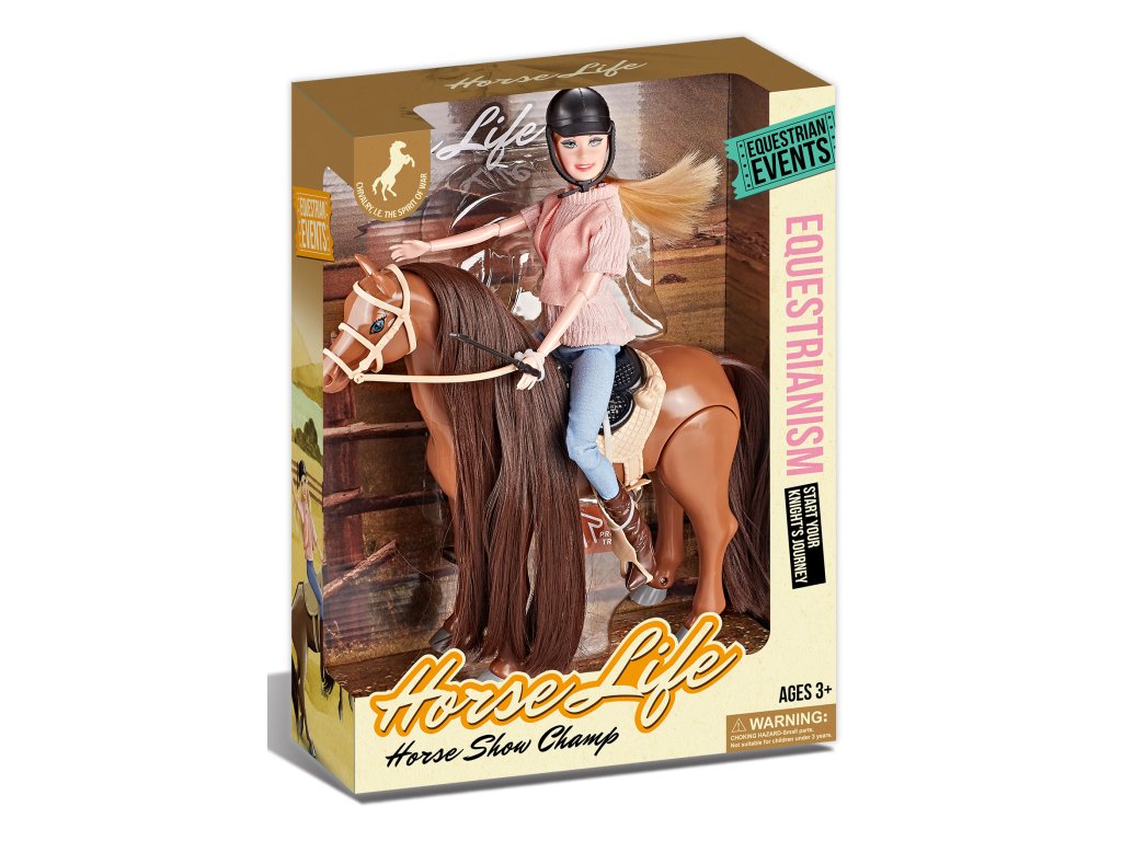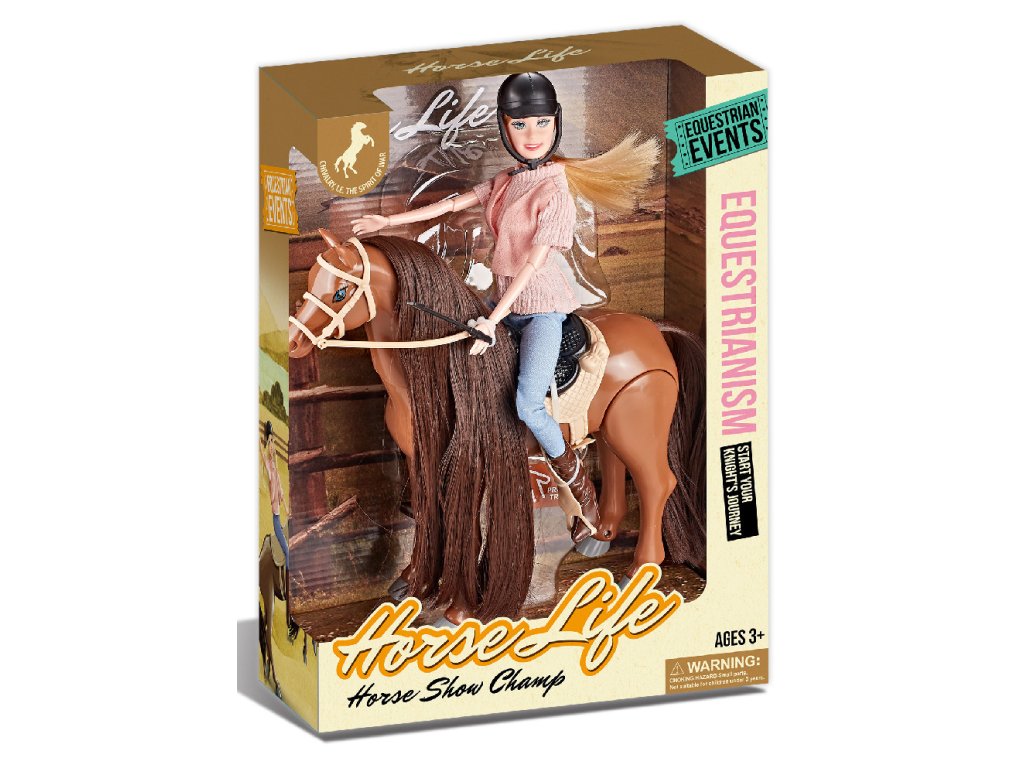 Jezdecký hnědý kůň na baterie se zvuky + jezdkyně