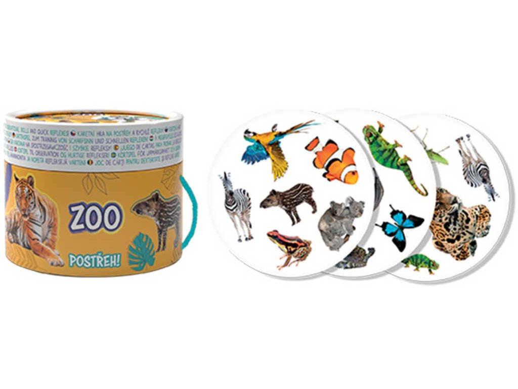 Karetní hra na postřeh a rychlé reflexy obsahuje 30 barevných kartiček ke hraní v tubě s oblíbeným motivem zoo a seznamem všech zvířat. Součástí balení jsou i pravidla, jak si hru zahrát.