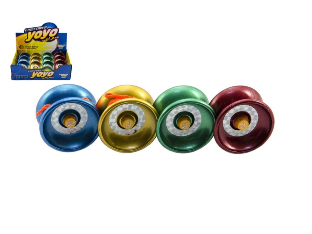 Kovové jojo tvoří dva stejně velké a těžké disky. Na ose je namotán bavlněný provázek a na jeho druhém konci je smyčka. Smyčku si navléknete na prst a můžete si s jojem hrát.