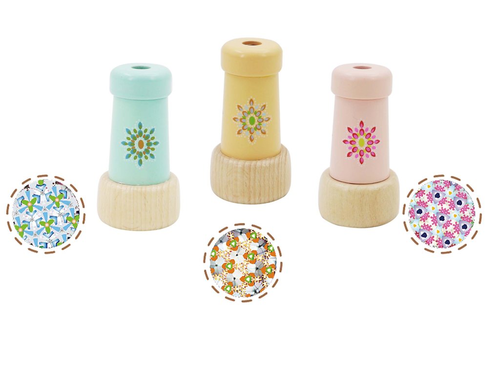 Kaleidoskop dřevěný. Rozměry 4,5x4,5x8,3 cm. 12 ks display box. 3 varianty - modrý, žlutý, růžový.