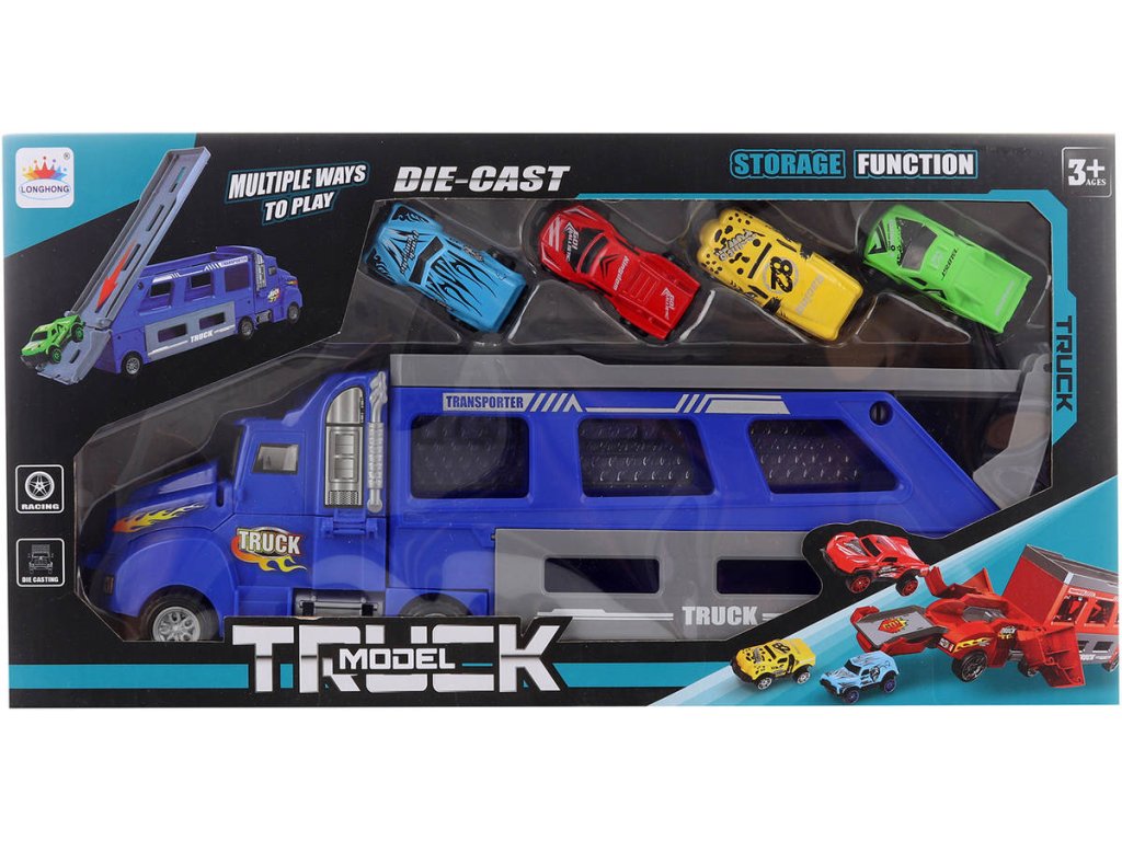 Herní set tahač s auty z kovu a plastu. Součástí velký kamion o velikosti 36cm, s vystřelovací dráhou a 4 malá autíčka. Nastavitelná rampa, rozložitelná kabina s funkcí vystřelování autíček na mechanickém principu (po stisknutí tlačítka).
