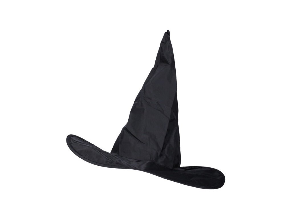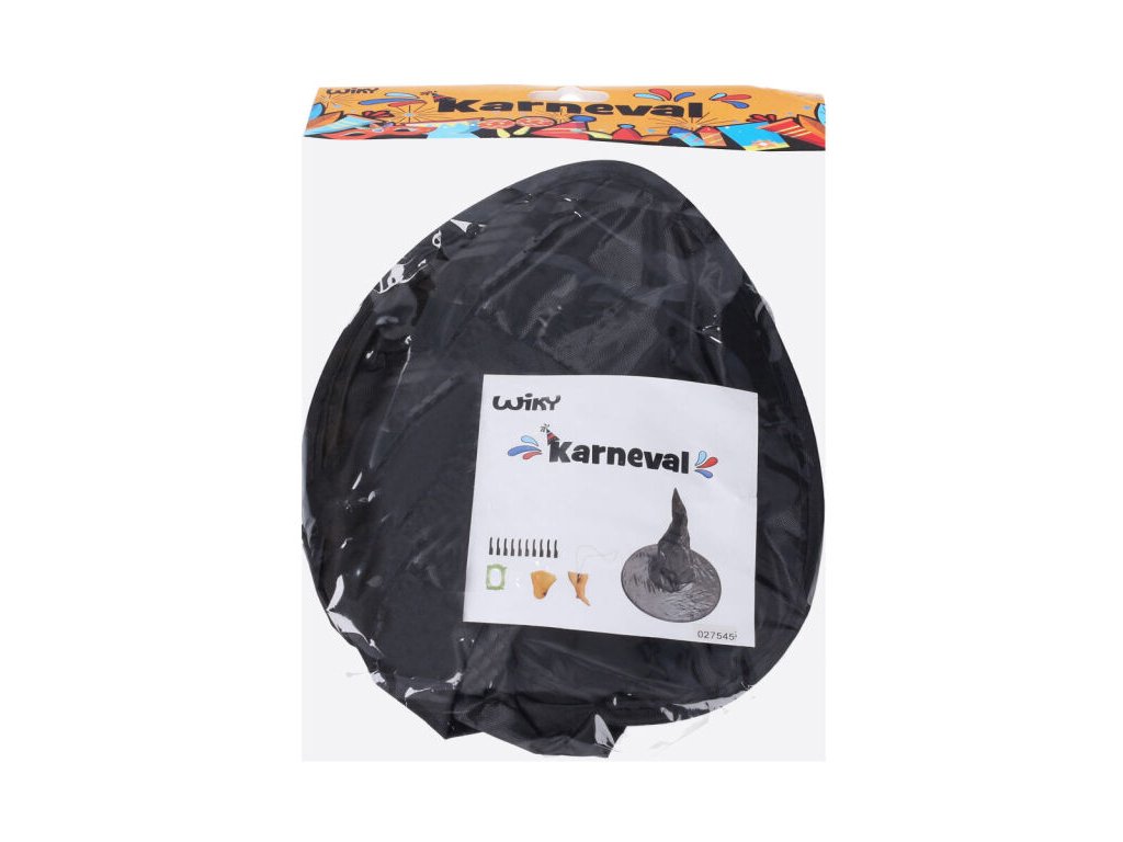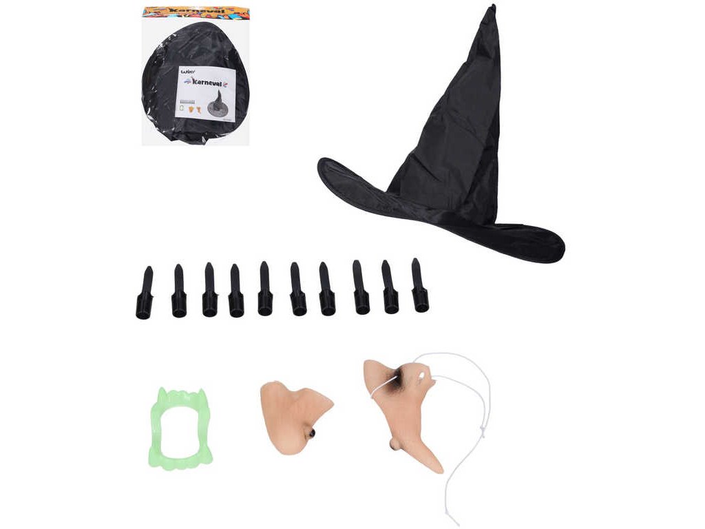 Velký čarodějnický set s černým špičatým kloboukem, nasazovacími prsty, s nosem a bradou na gumičce a se zuby. Baleno v sáčku.