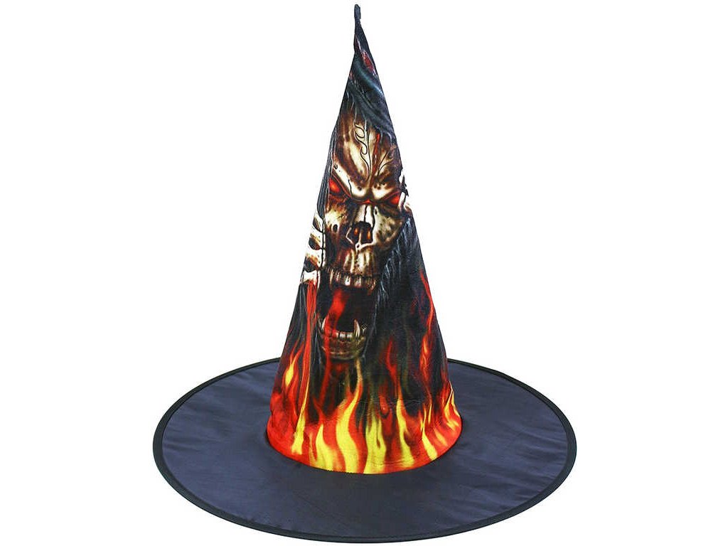 Čarodějnický černý klobouk s potiskem plameny a zombie pro dospělé! Staňte se hvězdou karnevalového večírku díky tomuto nepřehlédnutelnému klobouku a ohromte tak všechny své přátele!