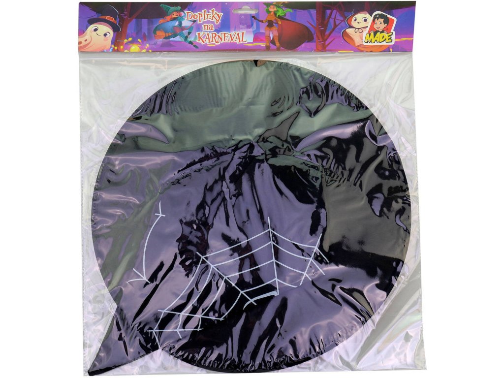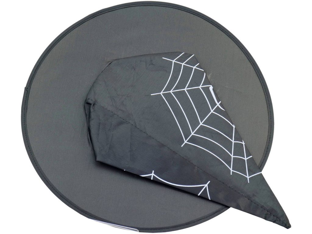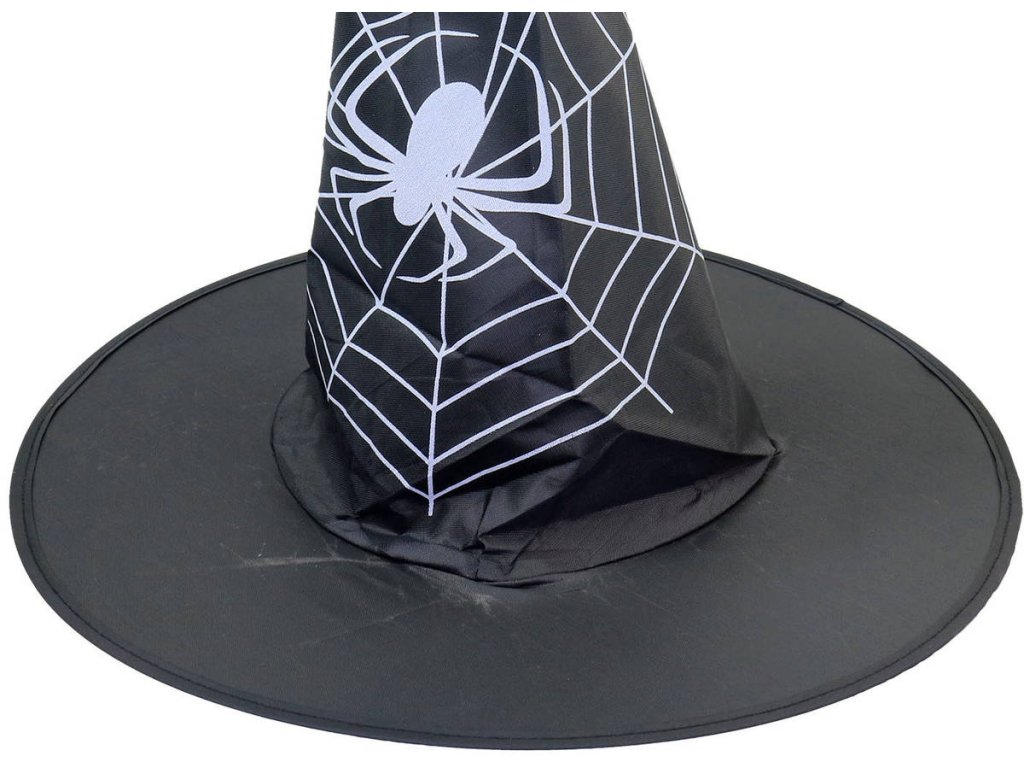 Špičatý černý klobouk pro čarodějnice a čaroděje. Bílý potisk pavučina s pavoukem, doplněk ke kostýmu Čarodějnice, na karneval.