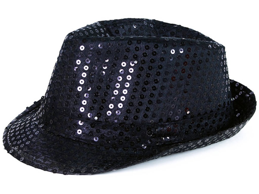 Třpytivý černý flitrový klobouk ve stylu Disko. Vhodné na párty či karneval, jako doplněk ke kostýmu. Klobouček na baterie, s LED světlem.