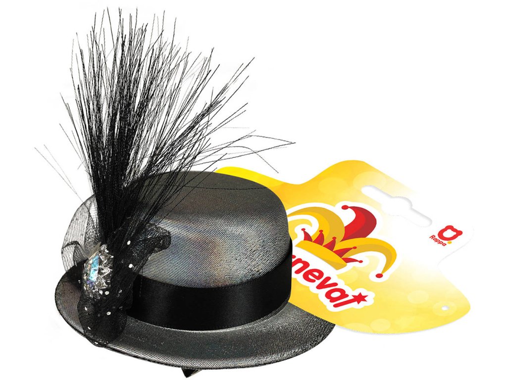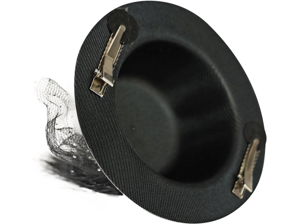 Mini klobouček stříbrné barvy s černou stuhou, peřím a tylem je doplněn šperkem. Připevnit klobouček k vlasům je možné pomocí dvou sponek.