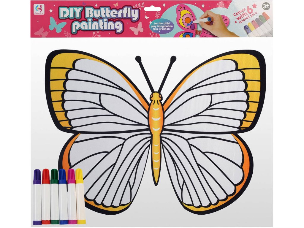 Obsah balení: motýl k vybarvení, barevné fixy 6x