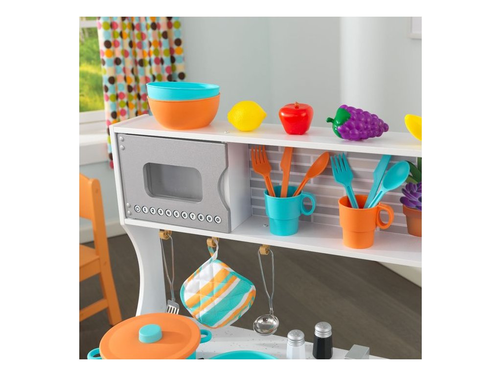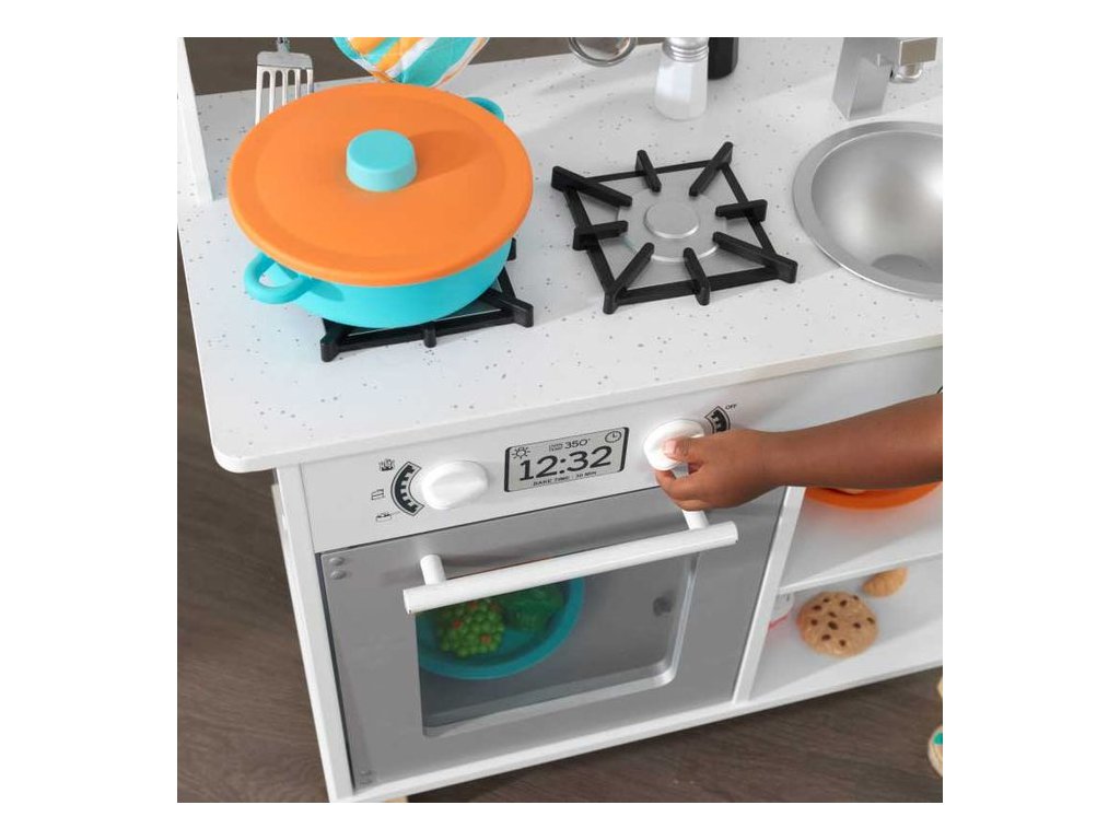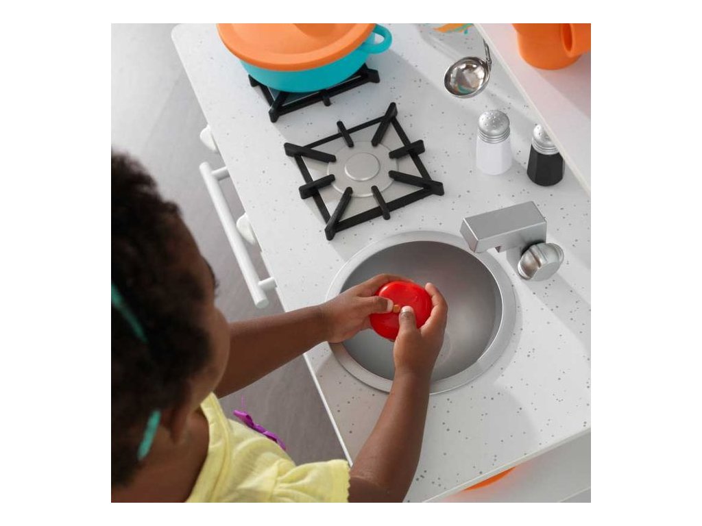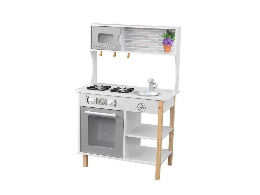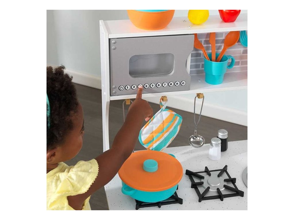 Dřevěná kuchyňská má přesně to, co váš malý kuchař potřebuje, aby uvařil oběd pro celou rodinu. V této kuchyňce najdete knoflíky, které lze otáčit a cvakají realistickými zvuky. Dvířka trouby a mikrovlné trouby se otevírají a zavírají. Obsahuje 38 ks příslušenství. Součástí kuchyňky jsou také police, závěsné háčky a praktický odjímatelný dřez pro snadné čištění.
