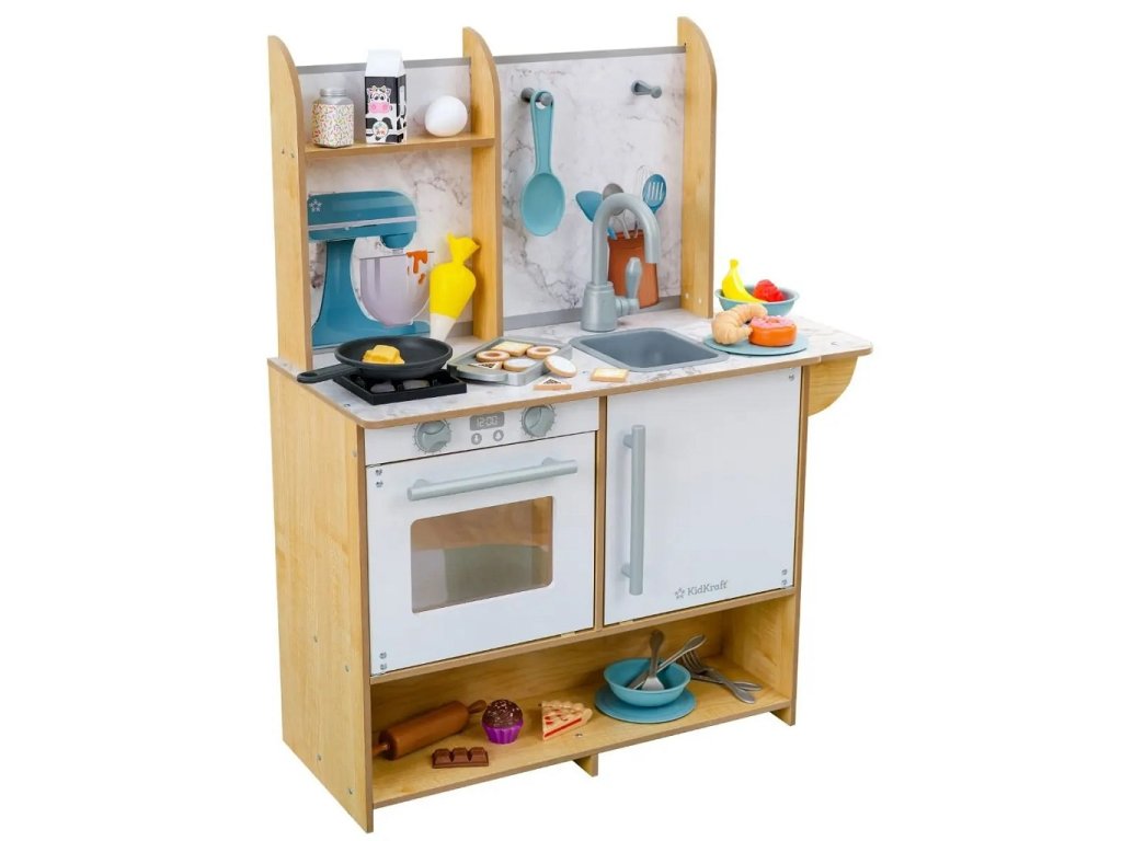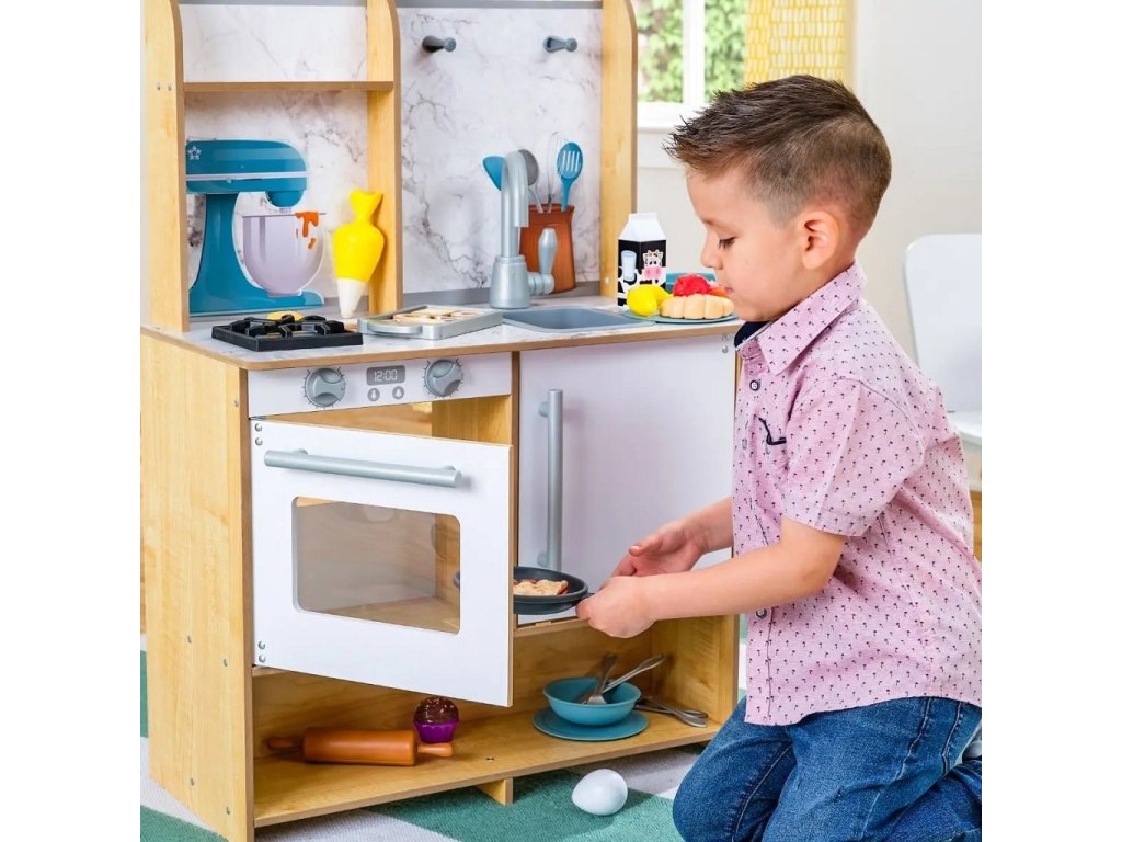 Efektivní kuchyňka Surprise Sweet z robustního dřeva nabízí nekonečné nápadité možnosti hraní. Za její pomoci můžete péct a zdobit nejrůznější dobroty! Pokud například naplníte zdobící sáček trochou vody a přiložíte jej na vrch sladkého pečiva budete svědky kouzla! Dříve bílý povrch ukáže svou skrytou barvu! Kuchyňka je dále opatřena úložnými prostory, praktickými kolíky pro úchyt náčiní, boční servírovací policí a umyvadlem s otočným kohoutkem. Hlavní vlastnosti: chladnička a trouba se snadno uchopitelnými rukojeťmiumyvadlo s otočným kohoutkemsada obsahuje 32 jídel, pánev, podnos a nádobí Dokumentace: návod k sestavení
